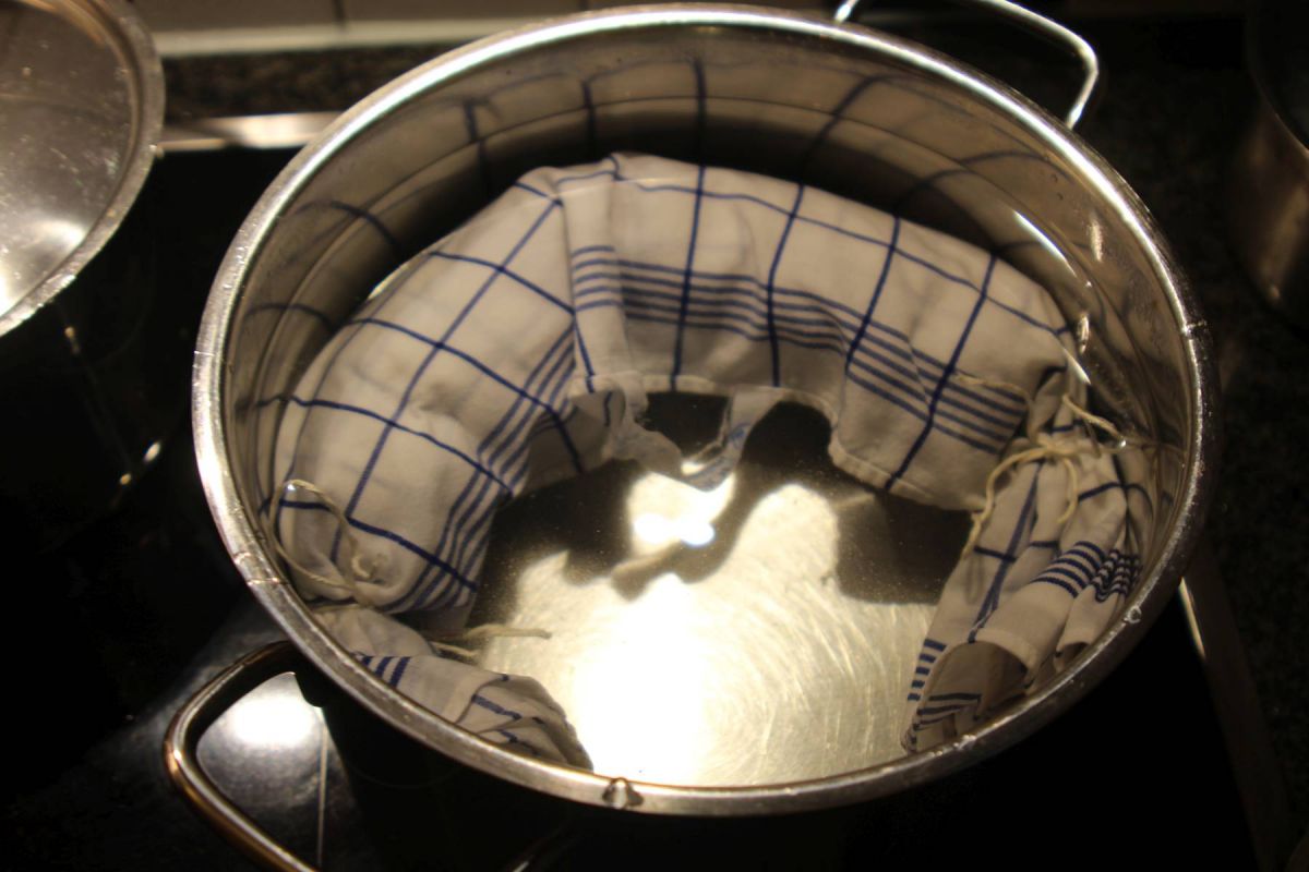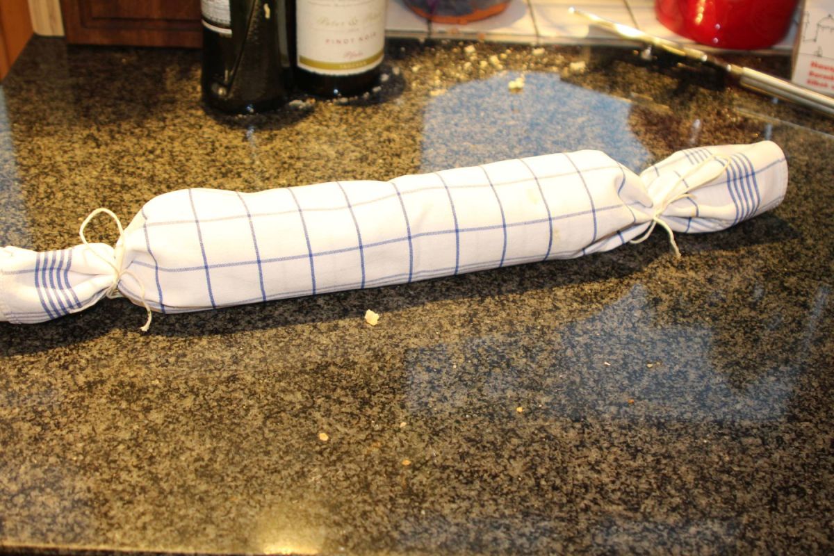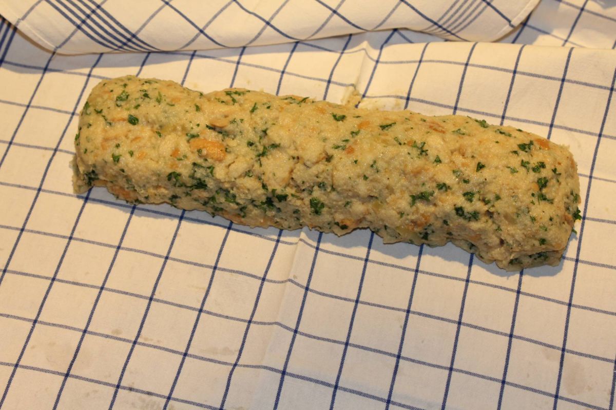 Mit feuchten Händen zu einer Wurst von etwa 8 cm Durchmesser formen. In ein sauberes Küchentuch wickeln, nicht zu stramm, beim späteren Sieden wird die Masse etwas größer.