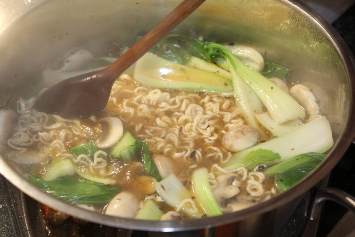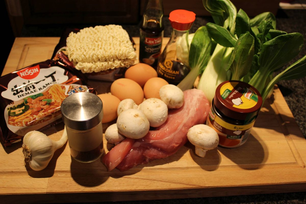 Arne entscheidet sich für Rindfleischbrühe aus dem Glas und Sojasoße. Als Einlage wählt er Pak Choi Gemüse eine handvoll Champignons, das obligatorische Ei und Schweinefilet im Stück in Sesamöl gebraten, dazu etwas Knoblauch.