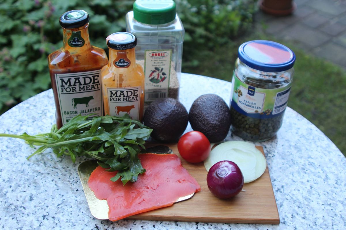 Erste Lage Lachs, dann rote Zwiebelringe, Kapern und einige Blätter vom Rucola. Obendrauf ein bisschen gerösteten Sesam streuen.