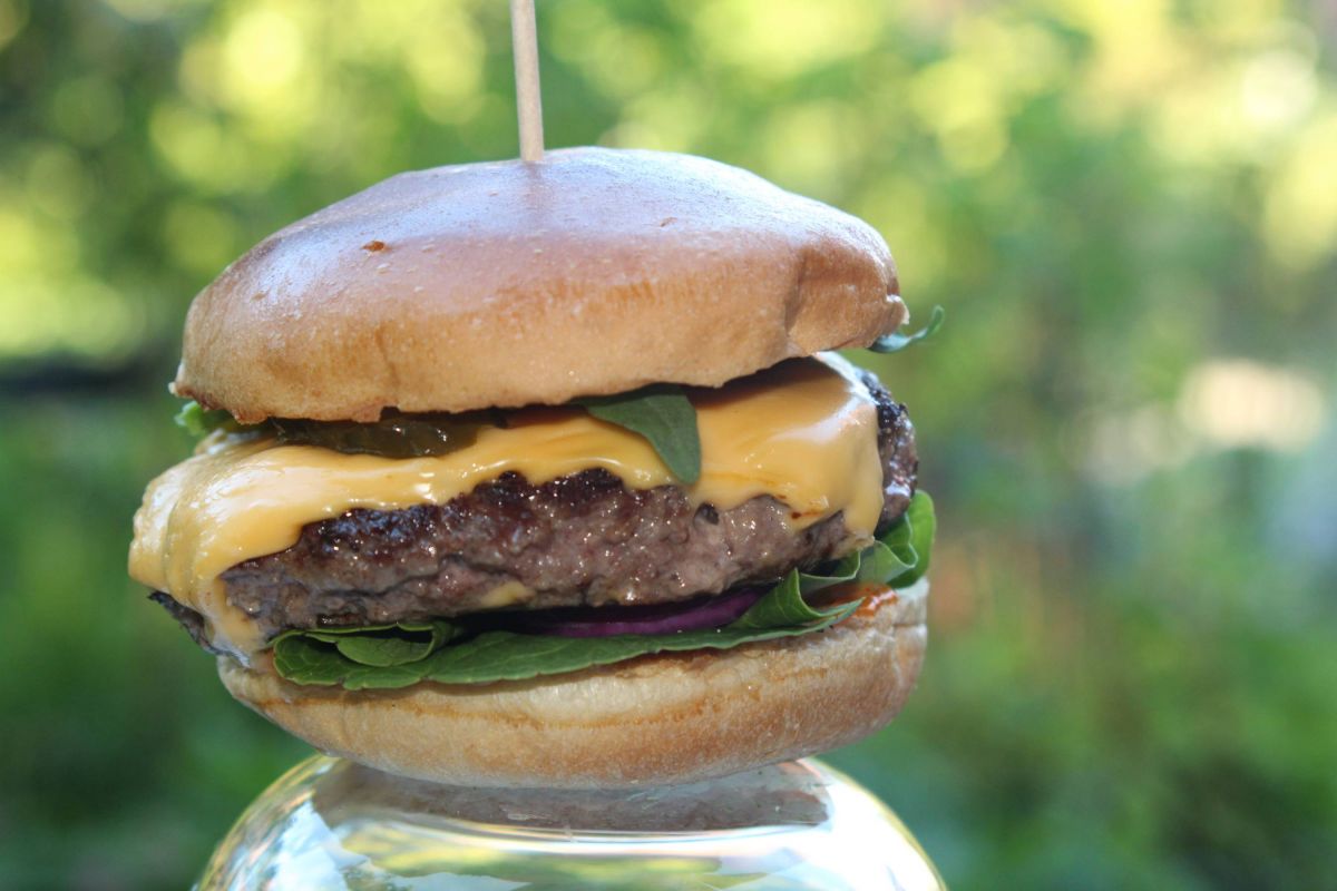 Oder, vielleicht etwas überladen: Mit einem RindfleischPatty, Zwiebelringen, Tomate, Relish und Salatblatt.