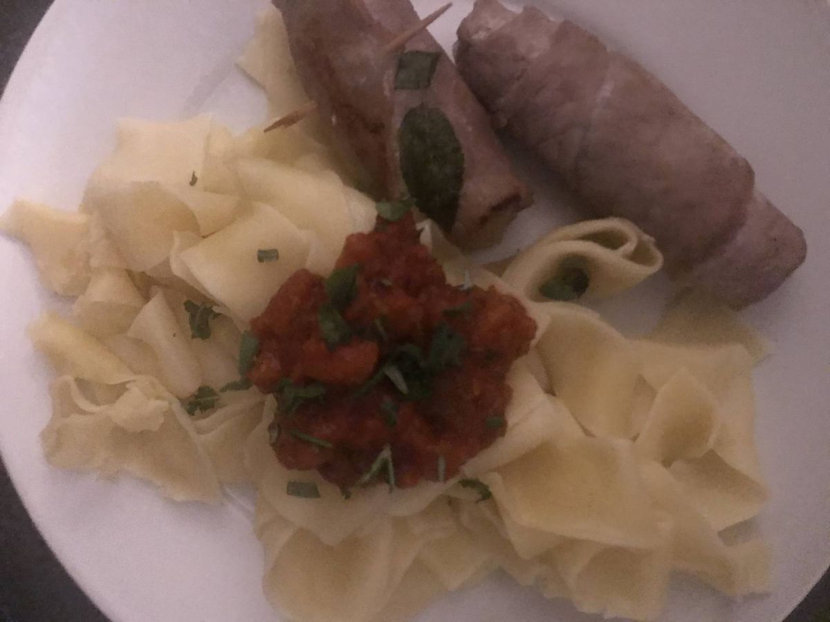 - Involtini vom viel zu jung gestorbenen Kalb auf Tomatensugo, aufgefunden in unmittelbarer Nähe von leblosen Pappardelle