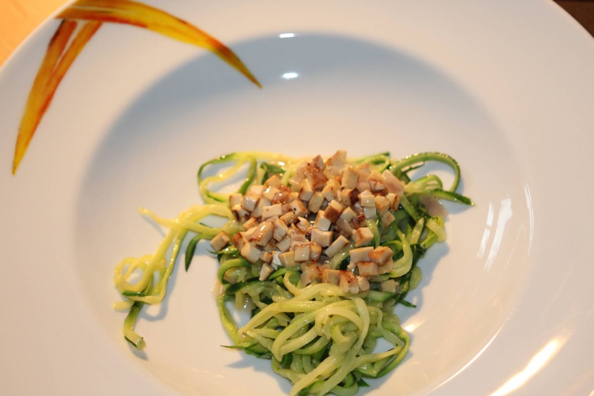 Die Gemüsenudeln 3 Minuten in einer Pfanne mit Öl anbraten und mit etwas Gemüsebrühe ablöschen. Natürlich auch hier auf „al dente“ achten.