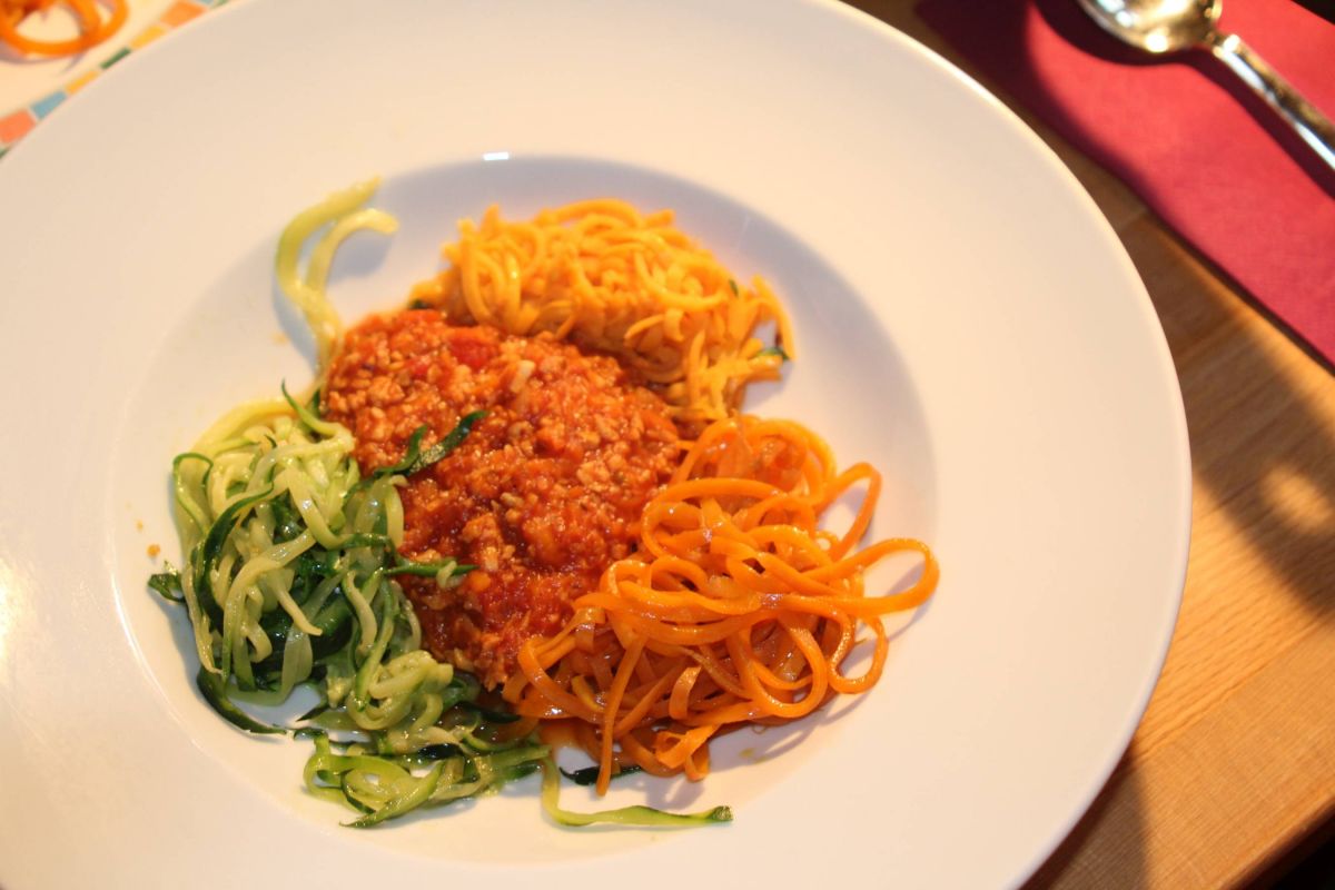 Eigentlich ging es um die Herstellung diverser Spaghetti aus vornehmlich Zucchini, Möhren und dann auch Süßkartoffeln. Ein Rausch beim Drehen ist vorprogrammiert.