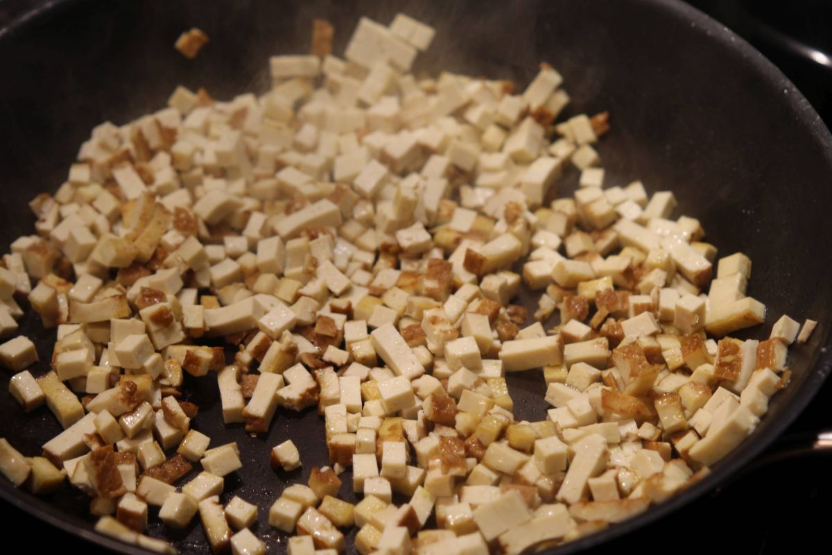 Den Räuchertofu und die Zwiebel sehr fein würfeln (wie Schinkenwürfel), den Knoblauch pressen. Das Mandelmus mit Wasser, Kala Namak und Hefeflocken zu einer Sahne mixen.