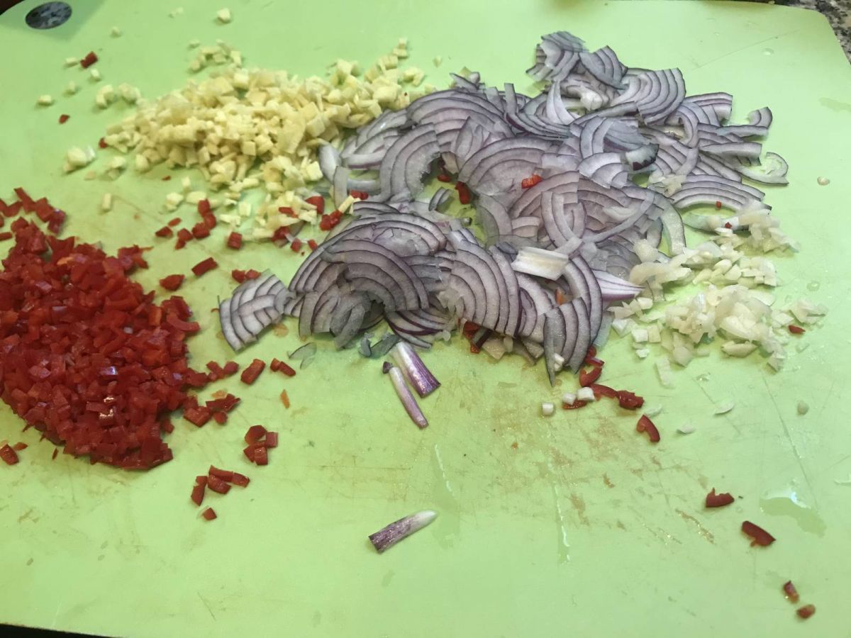 Ceviche besteht in seiner ursprünglichen Form aus kleingeschnittenem, rohem Fisch verschiedener Sorten, der in einem „Leche de Tigre“ (Tigermilch) genannten Sud mariniert wird. Der Sud besteht aus Limettensaft, Salz und Chilis - weitere Gewürze und Kräuter werden nach Geschmack hinzugegeben. Tilman wählt rote Zwiebeln, Knoblauch, Ingwer und Koriander für uns aus.