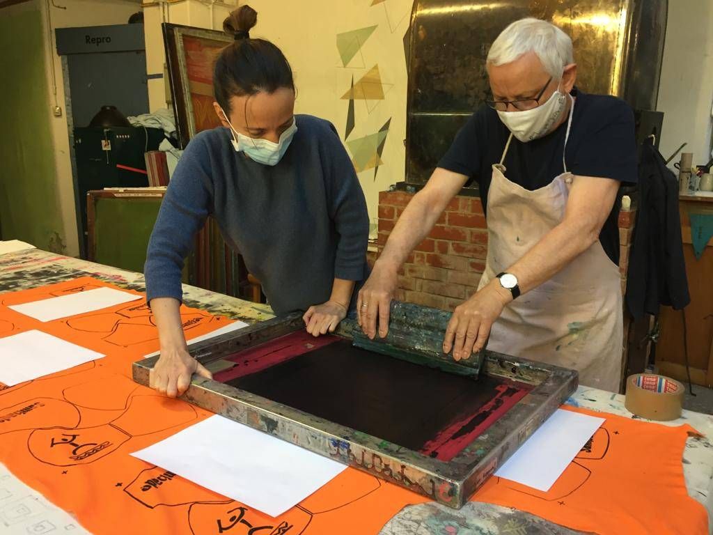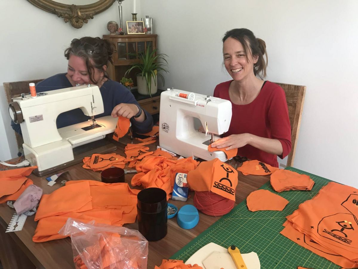 Sofort umgesetzt: Das Schnittmuster aus dem Netz, Jersey aus dem Vorrat und ein Siebdruckkurs mit Abstand und Marie, einer trommelnden Buchbinderin. Masken gedruckt und anschließend von Melanie, Hanna und Hans genäht. Dieses Nähevent wurde von Tilman kulinarisch begleitet und aufgewertet, und das ging so:
