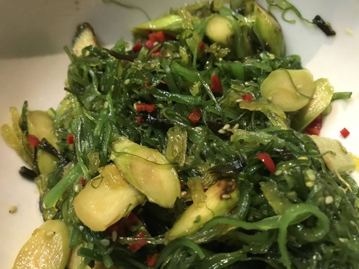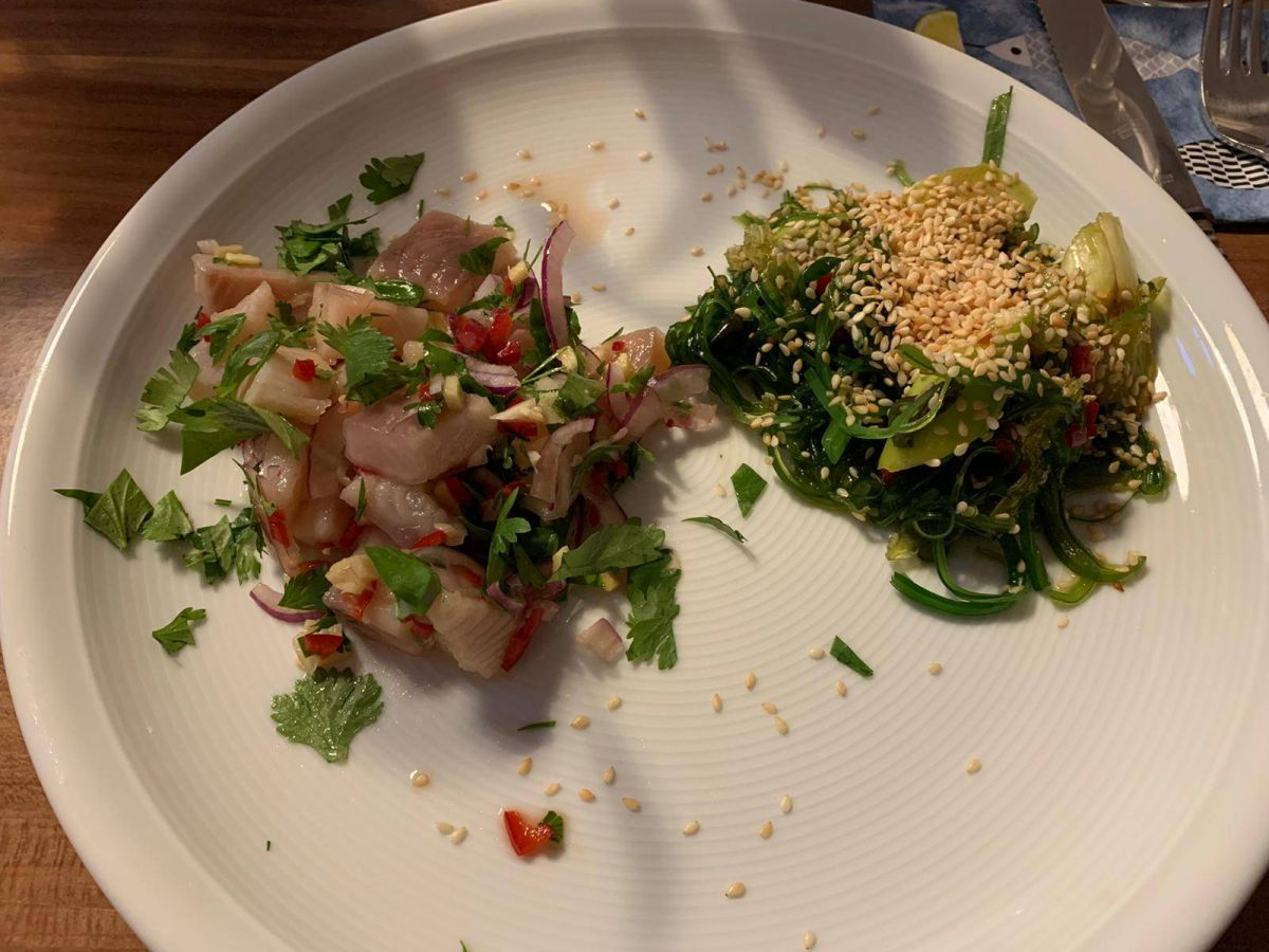 Tilman verrät uns seinen Trick: Fliegen-fangfrische Regenbogen Forelle filetieren, sofort tiefkühlen und vor Verwendung langsam im Kühlschrank auftauen lassen, dann in Würfel schneiden und mit reichlich Limettensaft ca 30 Min beizen/marinieren. Vor dem Servieren salzen und mit den weiteren fein gehackten Zutaten vermengen. Augenschmauslich auf dem Teller mit einem Salat aus Algen mit grünem Spargel (in Coronazeiten mangels Ernterumänen frisch eingeflogen aus Peru), gehackten Chilis und einem Topping aus geröstetem Sesam anrichten.