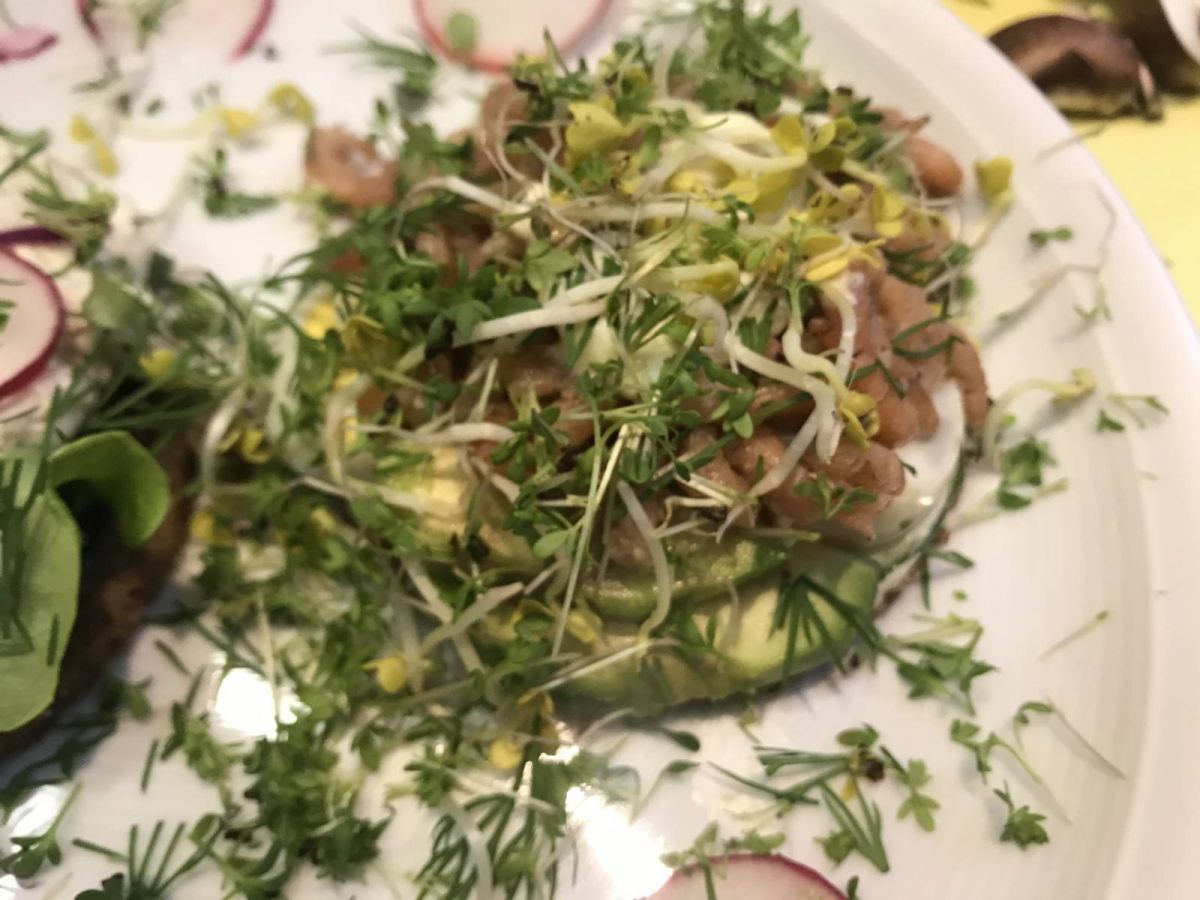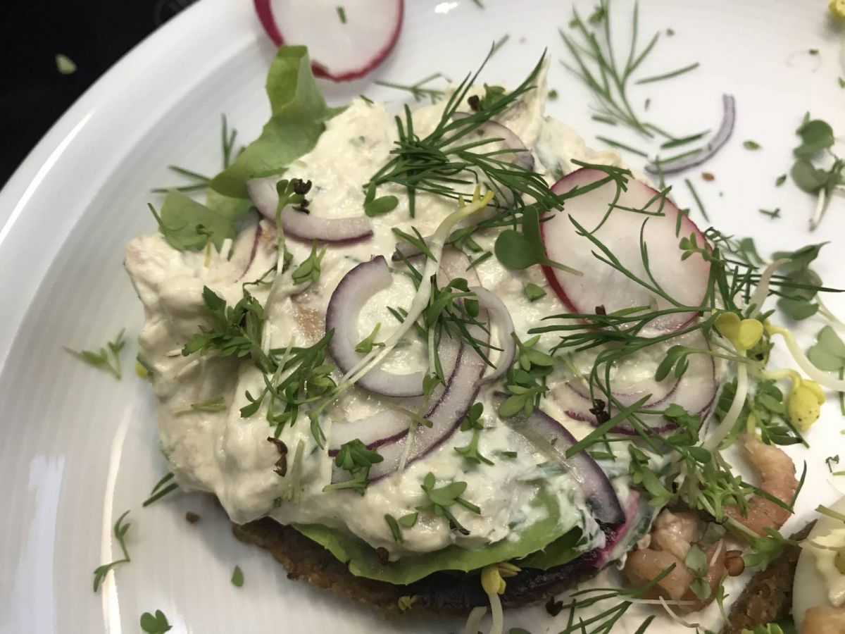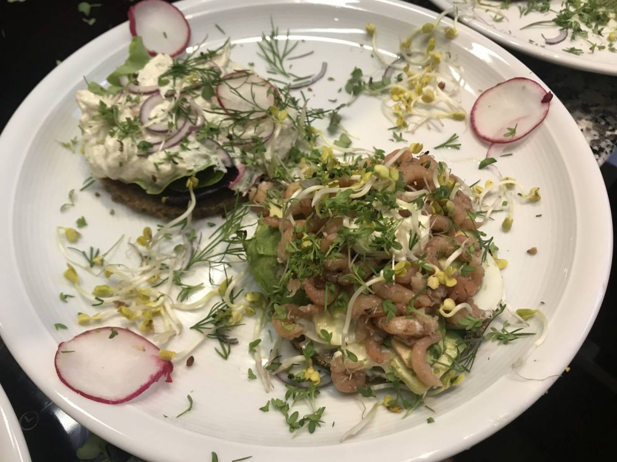 Nr 2 bekommt einen Aufstrich aus frisch und selbst gemachter Mayonnaise aus Ei, Öl, Senf und Zitrone, darauf hartgekochte Eier und Avocadospalten, dann folgt ein Berg Nordseekrabben und eine Garnitur aus Rettichsprossen, Kresse und Zitronenkresse.