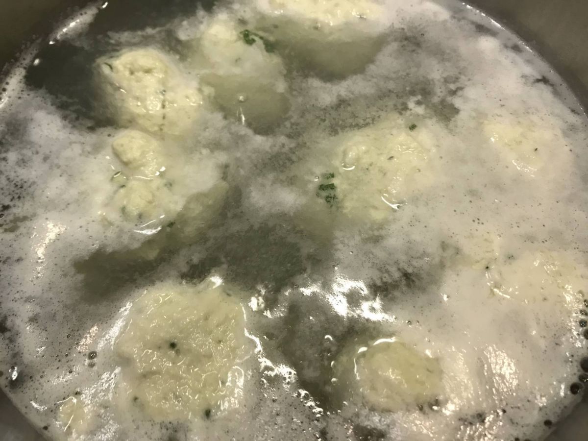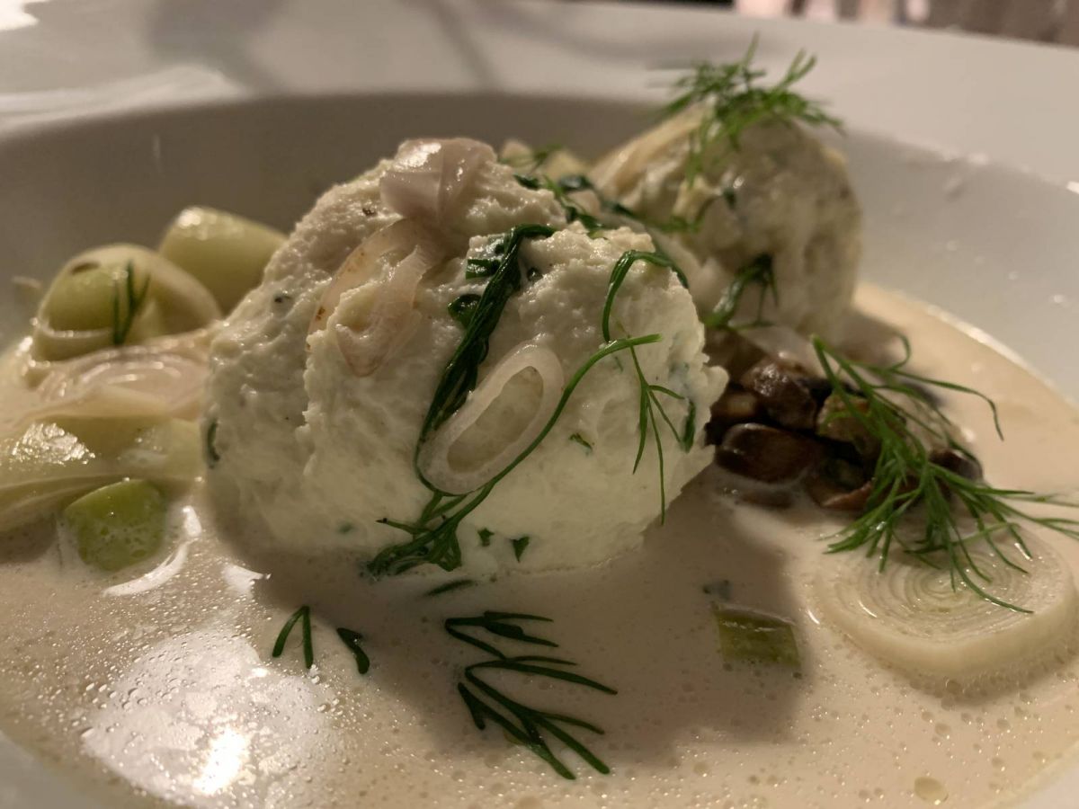 Auf 600g Fisch kommen 2 Eier, ganz viel Basilikum, Creme fraîche und Salz zum Abschmecken. Klößchen formen und wieder im Kühlschrank bis zur Verwendung lagern: Im Kochtopf 6 Minuten in siedendem Salzwasser ziehen lassen, anschließend mit dem Beiguss servieren, der mit Pfeffer und Salz abgeschmeckt ist. Mit Dill garnieren.