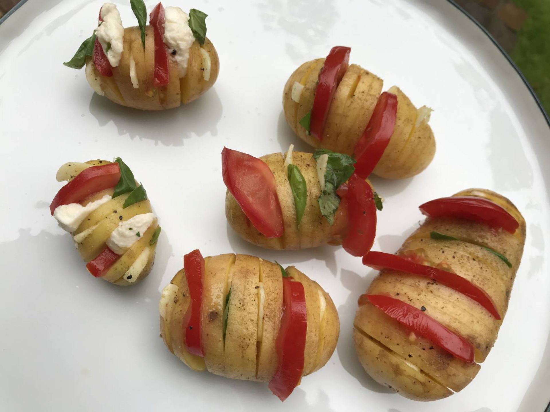 Kartoffeln alle 3 bis 5 mm mit einem scharfen Messer zu ¾ einschneiden und die Schlitze füllen mit dünn gehobeltem Knoblauch, blättrig geschnittenen Champignons, dünnen Streifen Paprika und/oder Basilikumblättchen anderen Kräutern, Mozzarella, oder ...