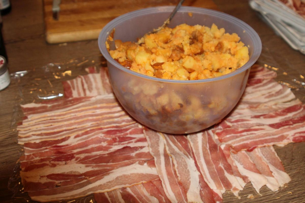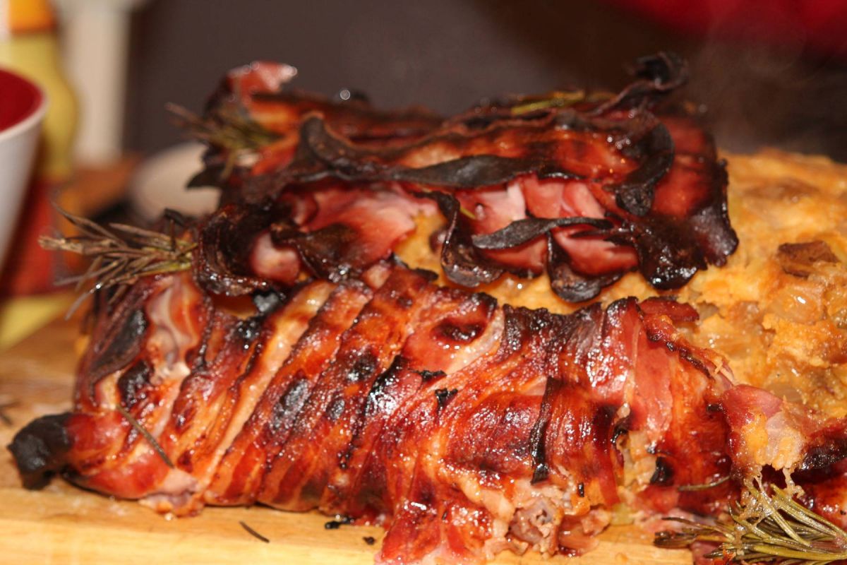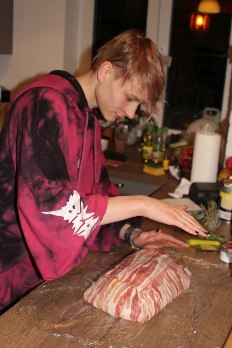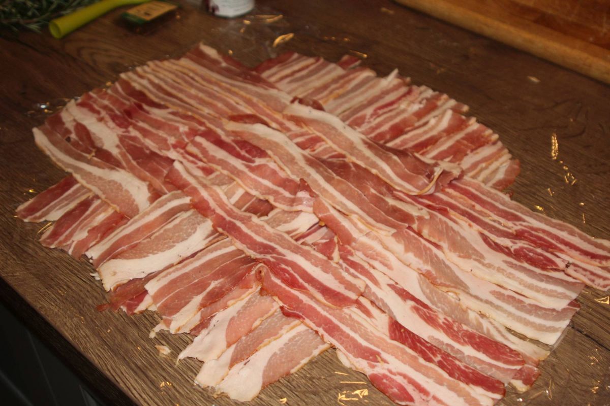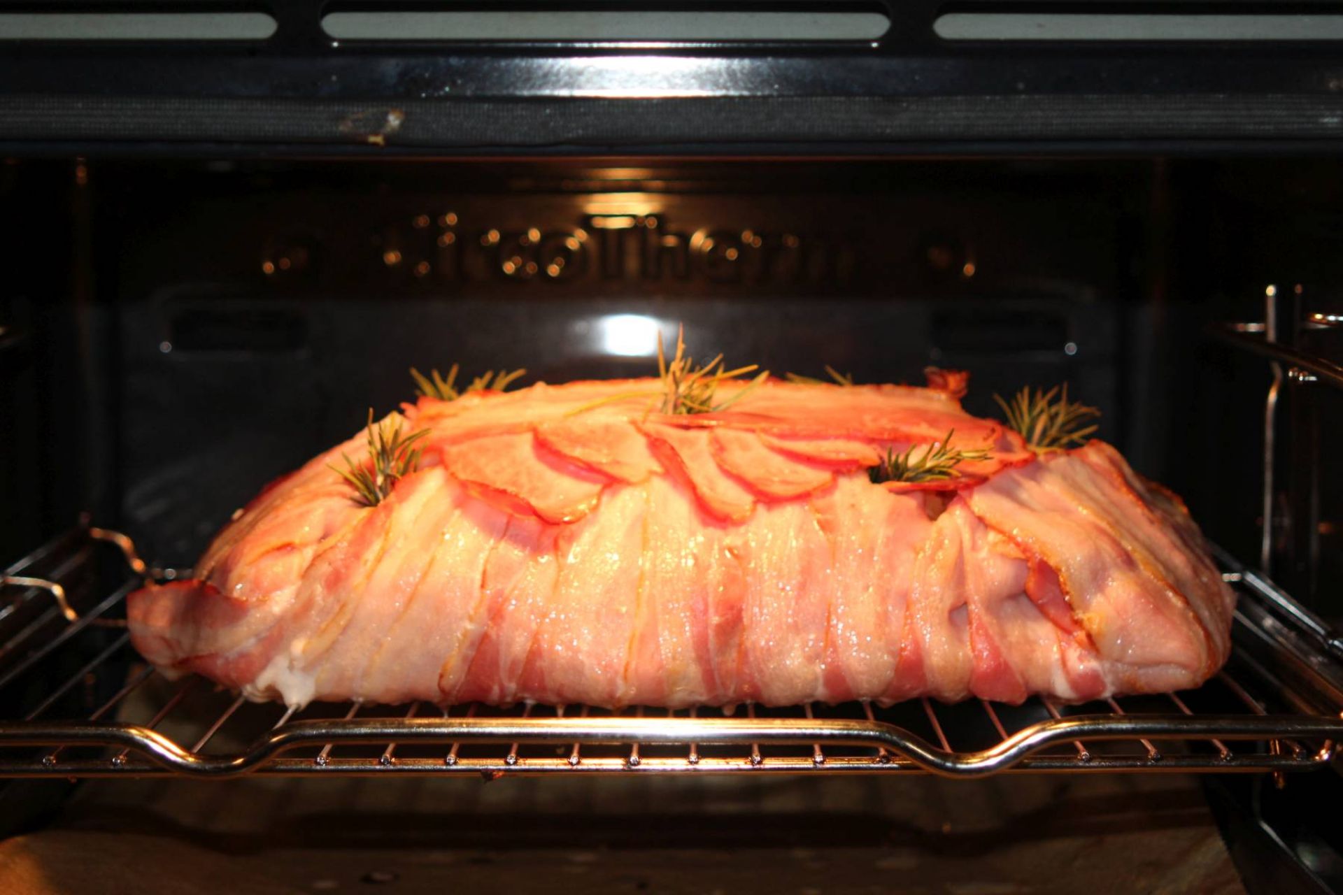 Die Masse jetzt auf dem Bacon schichten und formen, anschließend von allen Seiten unter Mithilfe der Folie zudecken und mit Rosmarin spicken.