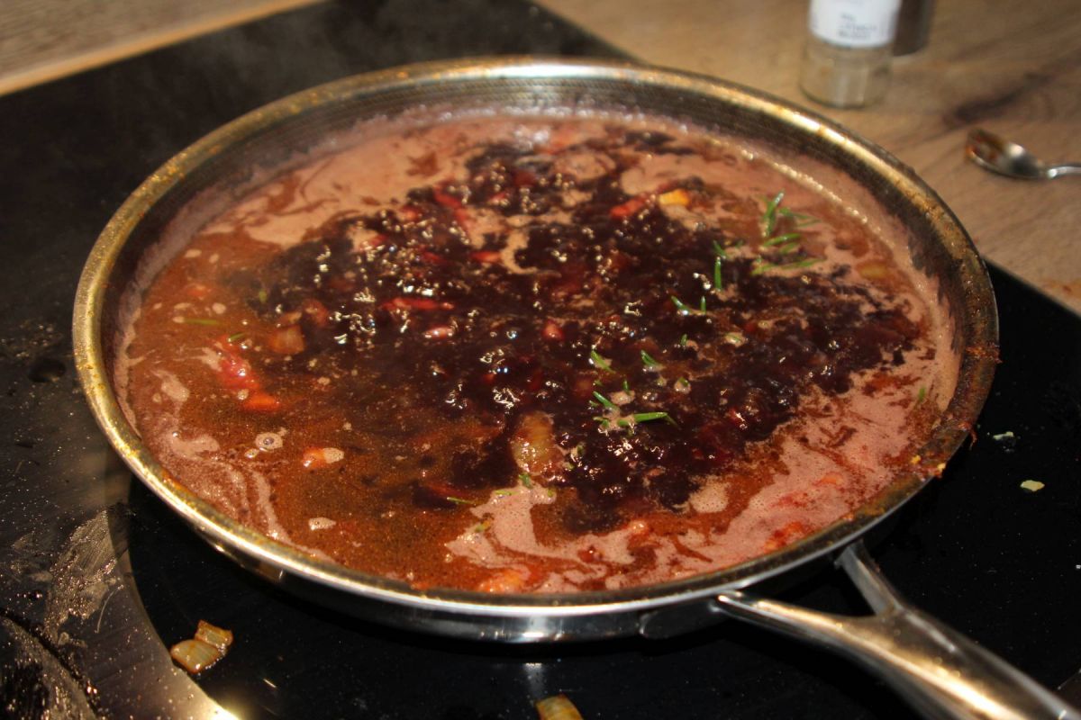 Während die Rolle für 30 Minuten in die Röhre kommt, kann die Soße angesetzt werden. Die restlichen Zwiebeln und Pilze mit ½ Liter Rotwein (Alkoholfrei?) ablöschen, Sojasoße und einen Zweig Rosmarin dazu und später mit Pfeffer und Salz abschmecken. Zum Schluss binden mit kalter Butter (und/oder Mondamin).