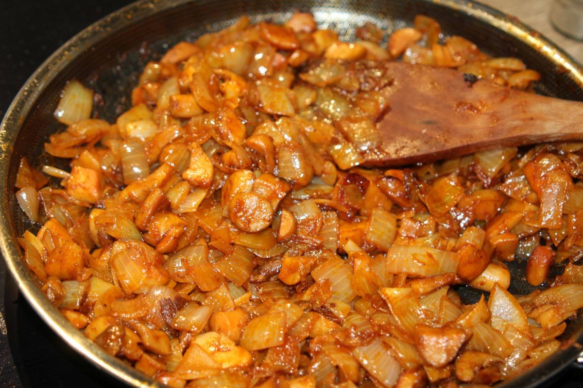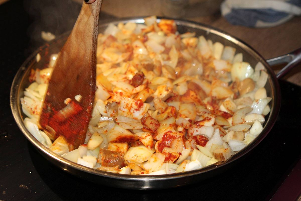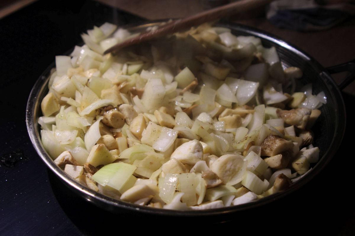 Parallel in der Pfanne 2 Streifen Bacon auslassen, etwas Butter dazu und die gehackten Zwiebeln mit den gewürfelten Saitlingen anbraten, pfeffern und salzen. (Petersilie dazu?)