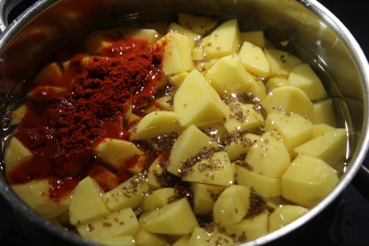 Die Kartoffeln etwas stampfen (nicht zu Brei verarbeiten), die Pfanne bis auf einen Rest dazu und vermengen.