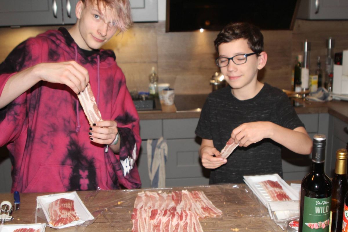 Jona und Beikoch Jannick laden ein zu falschem Schweinebraten, wie treudeutsch übersetzt wird.