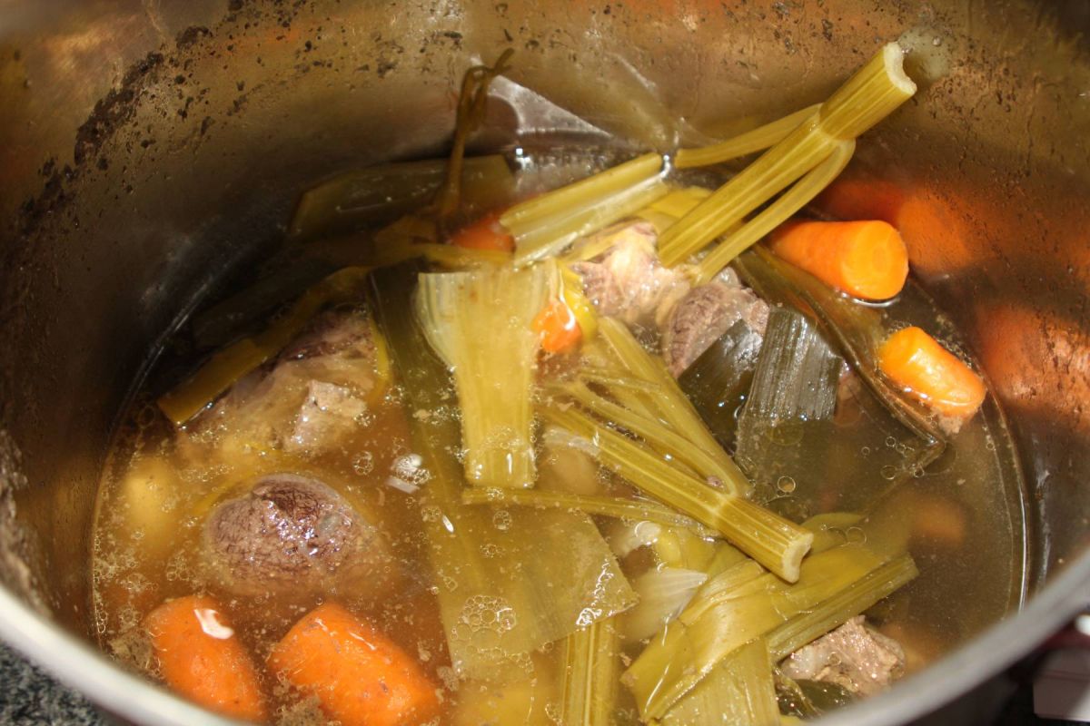 Die Suppe ist eine frische Rindersuppe auf Beinscheibe / Suppenfleisch und Knochen zusammen mit Suppengrün gekochte Basis. Die hält auch her für die Leberknödelsuppe.