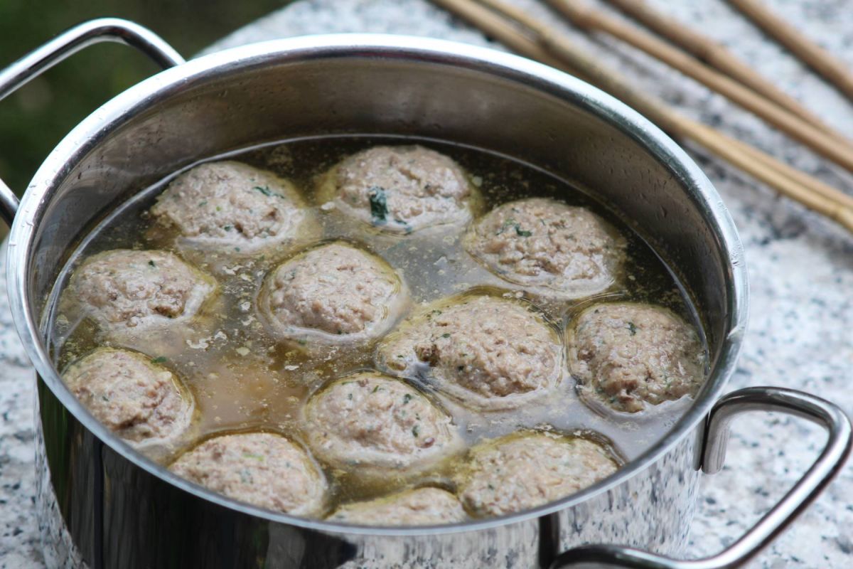 Mit feuchten Händen golfballgroße Leberknödel formen. Dann kommen die Knödel in die siedende Suppe und ziehen dort für 20-25 Minuten bis sie oben schwimmen. Suppe servieren – mit Schnittlauch toppen.