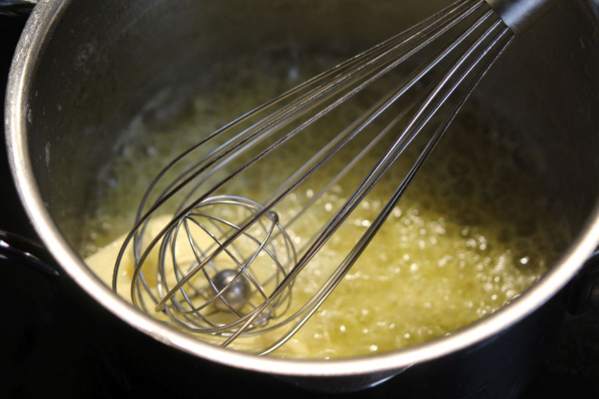 Die Butter leicht bräunen. Hier empfiehlt Renate einen hellen Topf, damit man den Bräunungsgrad erkennen kann! Die Butter abkühlen lassen. Anschließend die noch flüssige Butter mit dem Zucker und Vanillezucker schaumig rühren und jetzt nach und nach esslöffelweise Mehl unterrühren. Rühren mit dem Mixer auf niedriger Stufe.