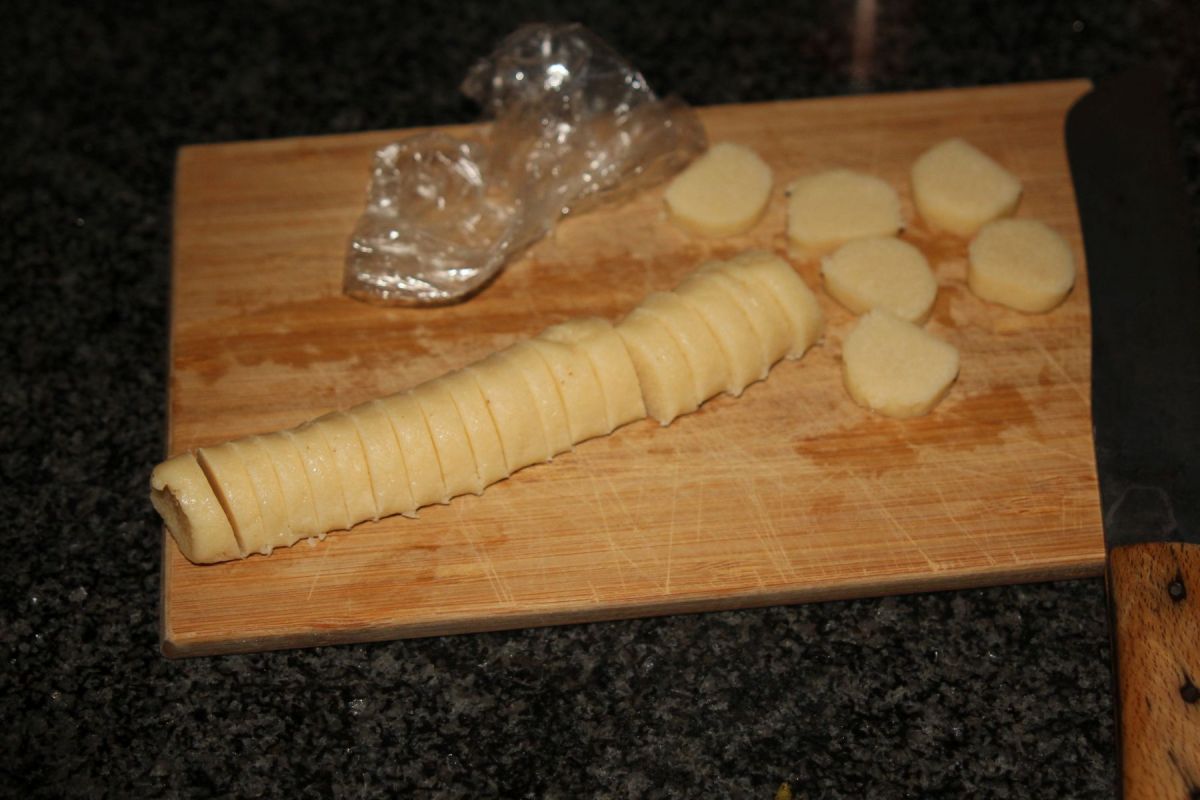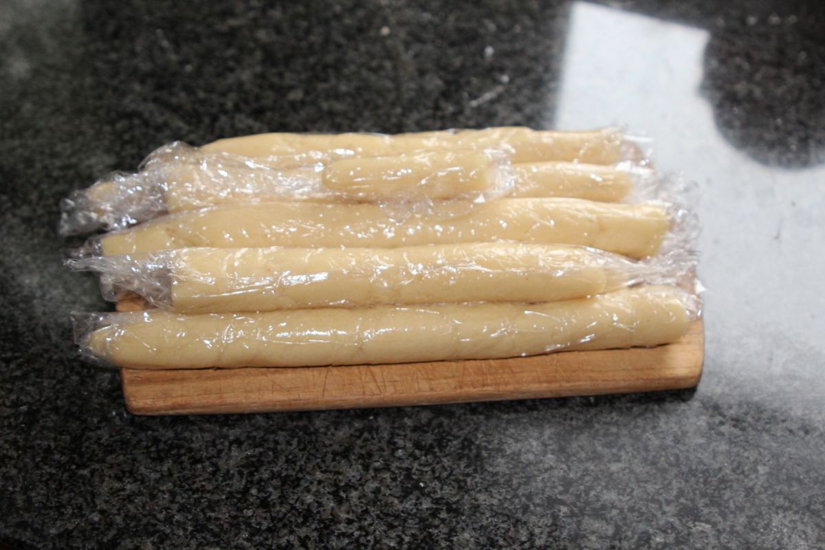 Das gibt am Ende ein krümeliges Gesamtbild, das geknetet und zu dünnen Rollen verarbeitet werden kann. Diese dann in Folie wickeln, im Kühlschrank ruhen und fest werden lassen.