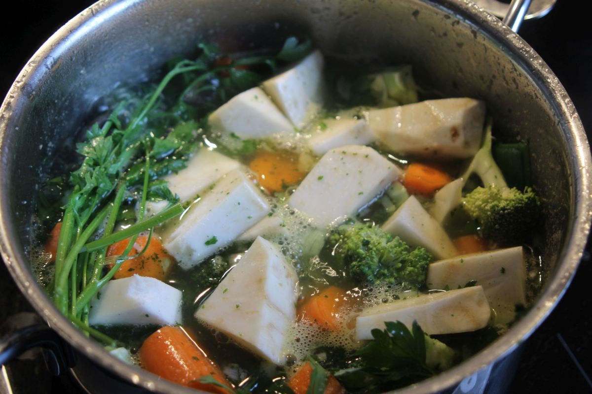 Die Hühnerbrühe nun salzen und mit dem Gemüse weiterkochen, anschließend pürieren.