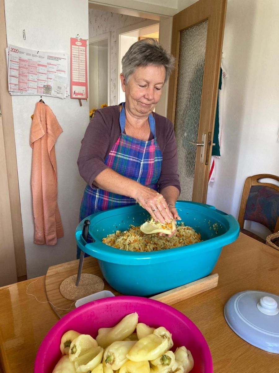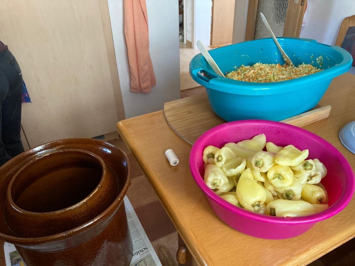 Zusammengemengt wird in ihrer Babybadewanne und prall gefüllt werden die geputzten Paprika ordentlich mit Zwirn umwickelt in großen Tongefäßen geschichtet.