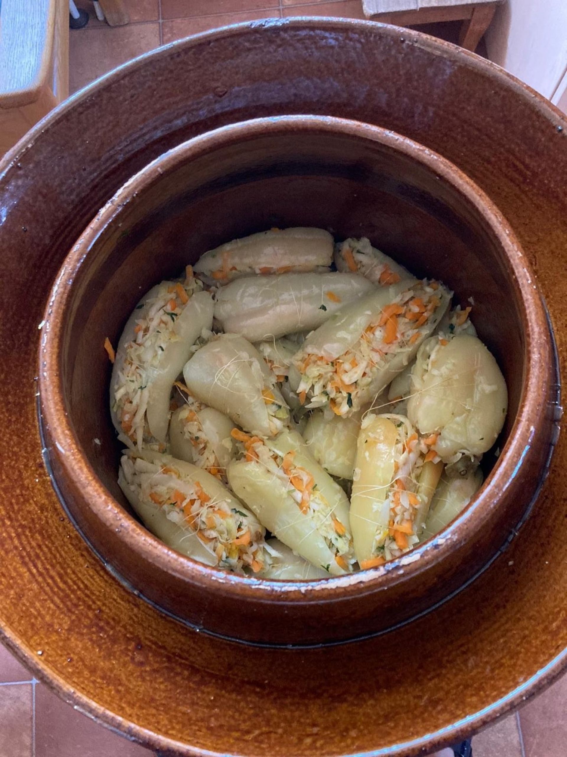 Zusammengemengt wird in ihrer Babybadewanne und prall gefüllt werden die geputzten Paprika ordentlich mit Zwirn umwickelt in großen Tongefäßen geschichtet.