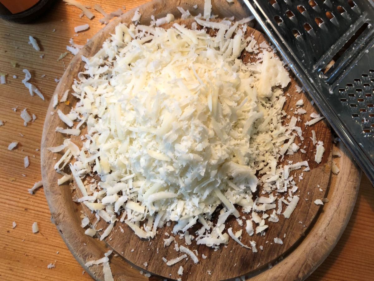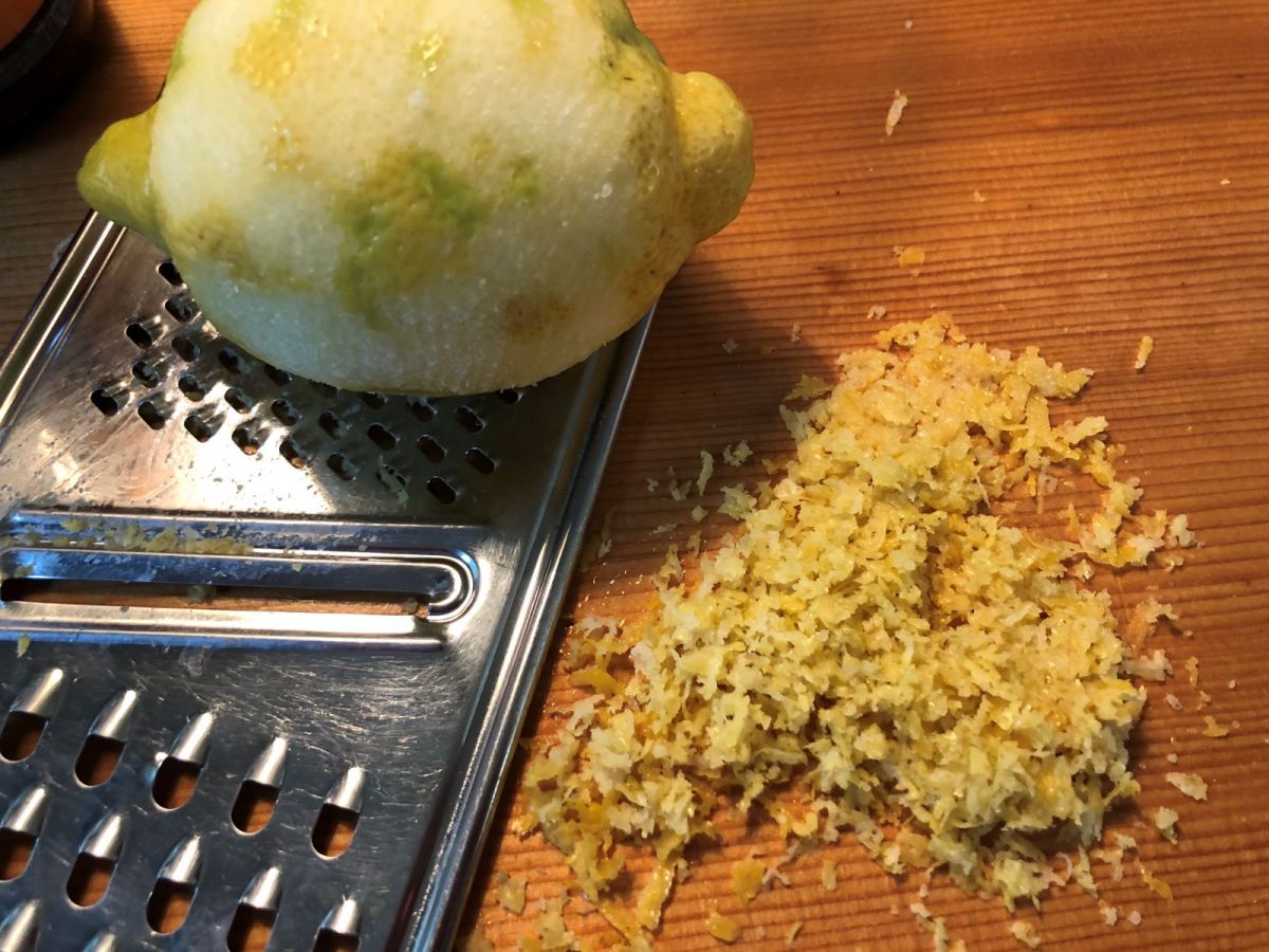 ZitronenRisotto hat naturgemäß etwas mit Zitrone zu tun. Also die beiden Zitronen waschen und die Schale von einer fein abreiben, auspressen und den Saft bei Gelegenheit ins Risotto rühren, ebenso den Abrieb – beides eher gegen Ende und da kommt auch der geriebene Parmesan dazu – und rühren und rühren und abschmecken und rühren und rühren. Salz ist in der Brühe und im Käse – muss wohl nicht extra.