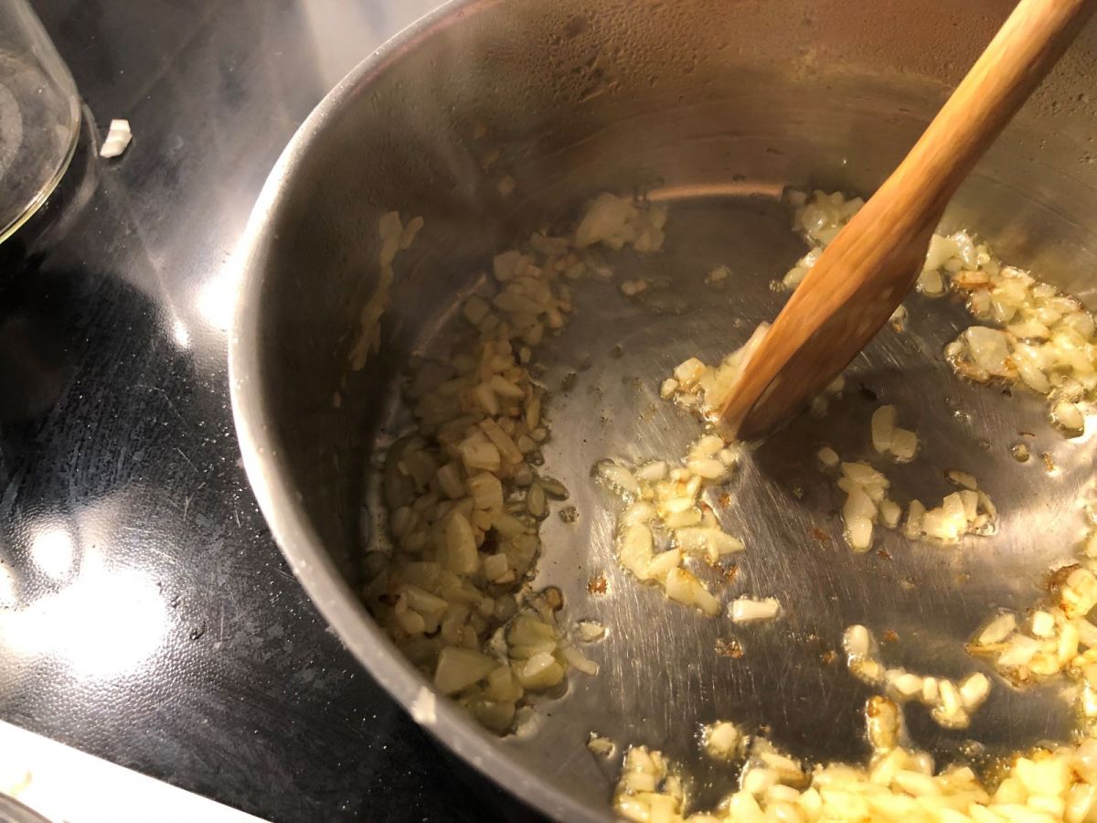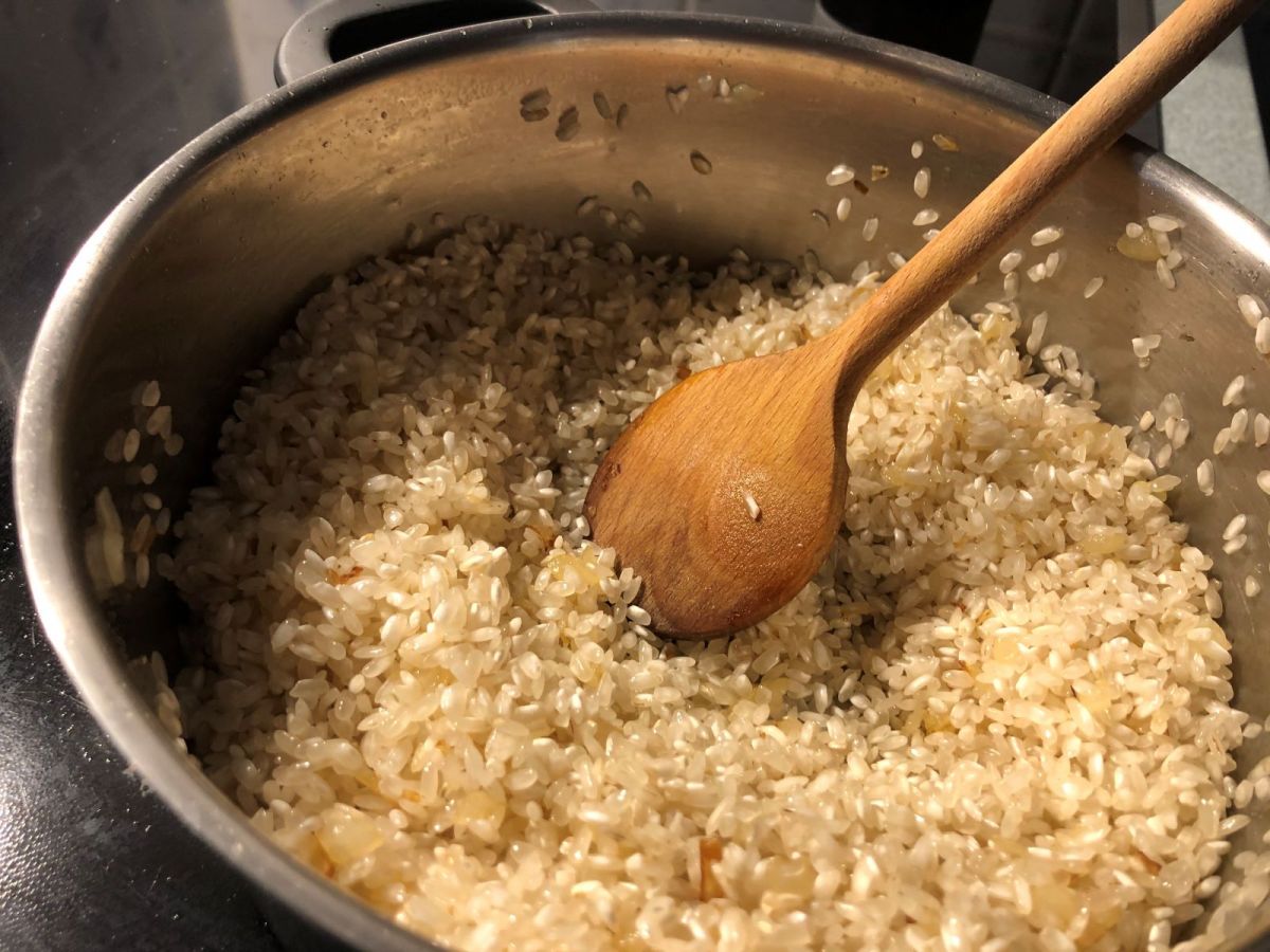 Christine schwitzt die kleingewürfelten Zwiebeln in Öl an, dann kommt der Reis hinzu und wird ebenso glasig geschwitzt. Nun beginnt der fesselnde Kochgang der Risottozubereitung. Fesselnd deshalb, weil man den angestammten Platz am Herd nun nicht mehr verlässt.