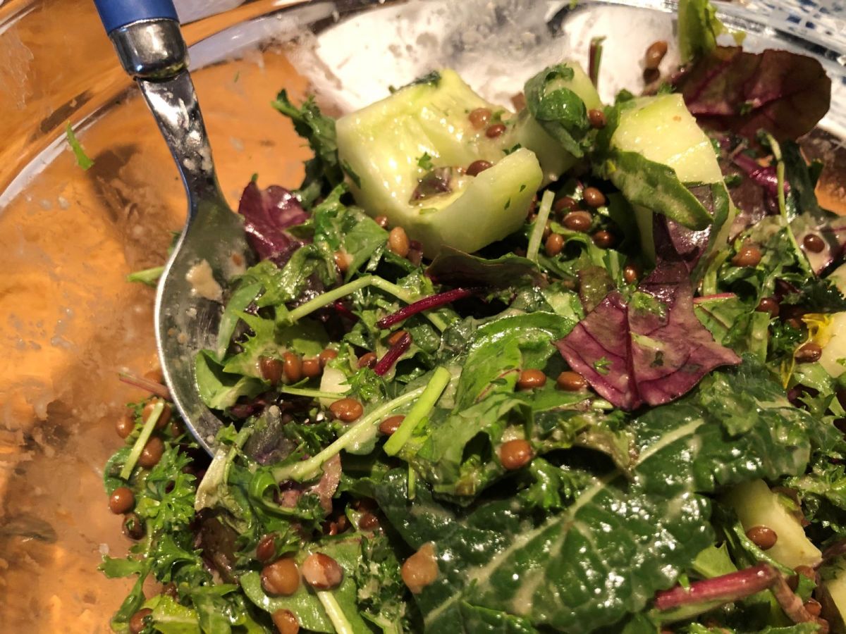 Rühren rühren, Brühe zugießen, rühren rühren bis die Flüssigkeit aufgenommen ist, Wein zugeben, rühren rühren bis … Gut wenn man eine 2. Männ*in in der Küche hat, die*der*divers einem den Schweiß abtupfen kann, das Gemüse schnippelt, die Hühnerbeine einölt und würzt, das Ganze für 30 Min und 200°C in den Ofen schiebt und derweil den Salat anrichtet.