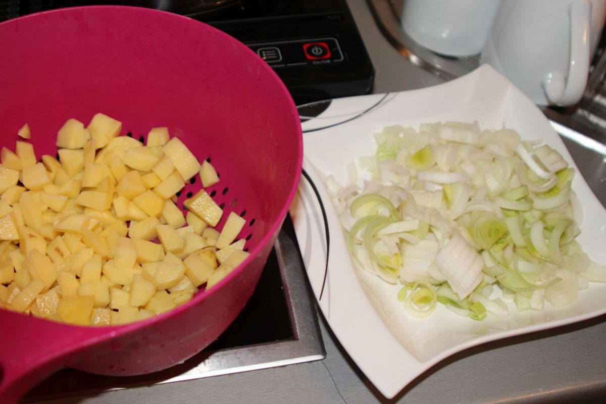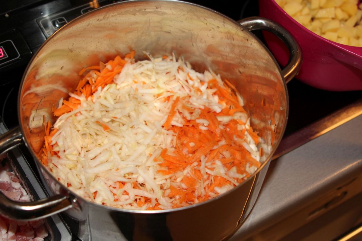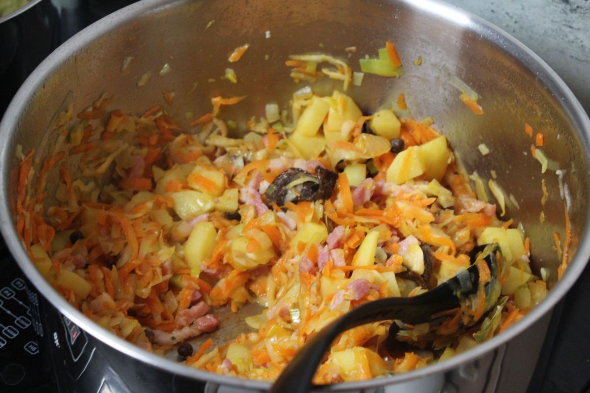 Zum Speck jetzt gewürfelte Zwiebeln und den dünn geschnittenen Lauch, danach geraspelter Sellerie, die Karotten, eingeweichte Pilze und klein gewürfelte Kartoffeln. Alles schön andünsten, 2 Esslöffel Instantbrühe dazu und mit Wasser auffüllen.