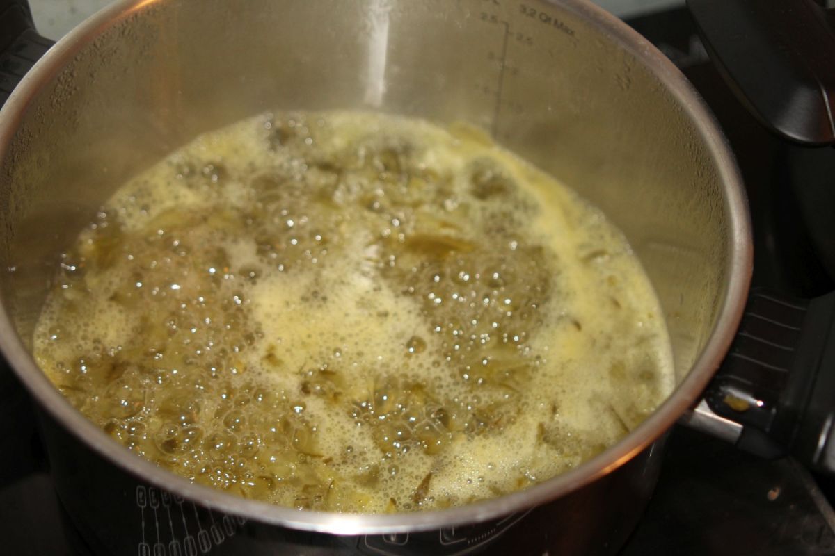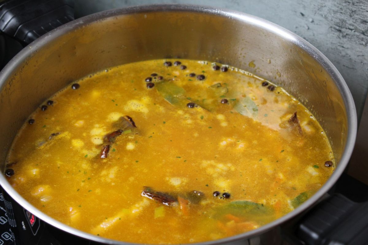 Lorbeerplätter und mindestens 10 Pimentkörner in die Suppe mit der inzwischen goldenen Farbe.