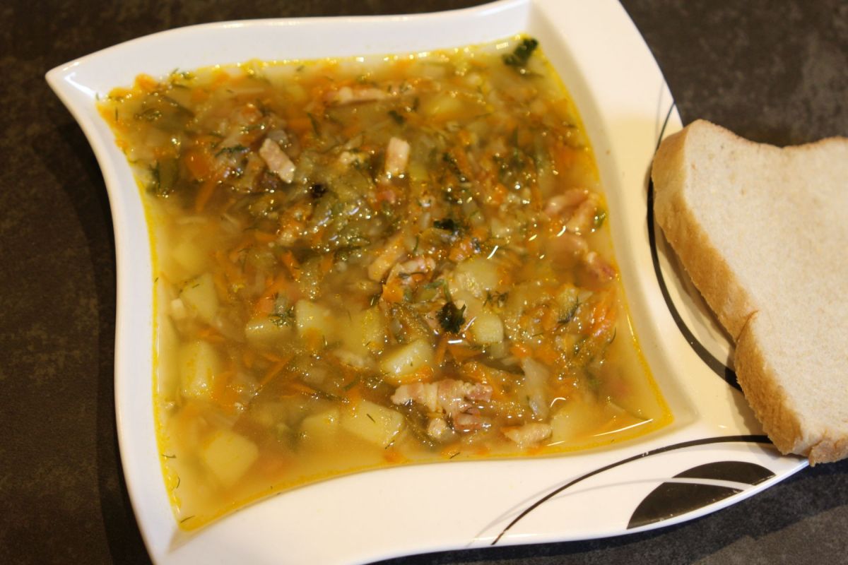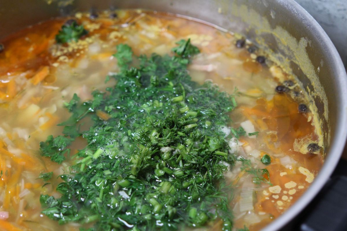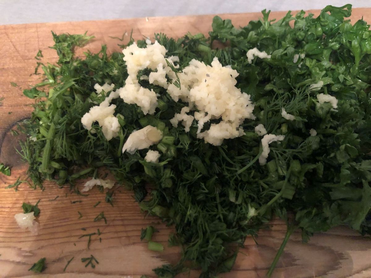 Ganz zum Schluss, wenn die Kartoffeln gar sind, die vorgekochten Salzgurken samt Kochwasser zur Suppe geben. Und vor dem Servieren die geschnittene Petersilie aus dem Suppengrün, den Dill und 2 Zehen frisch gepressten Knoblauch in die Suppe rühren.