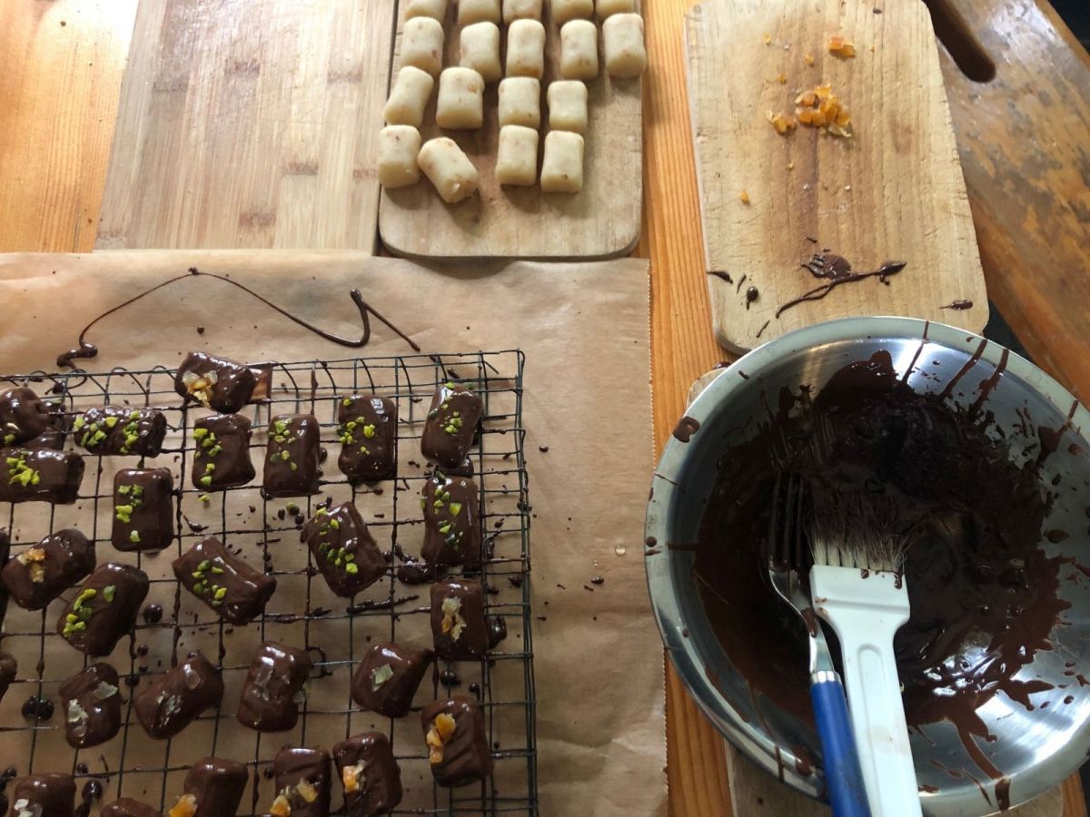 Dort wird auch das hilfreiche Werkzeug für die Pralinenherstellung gezeigt.