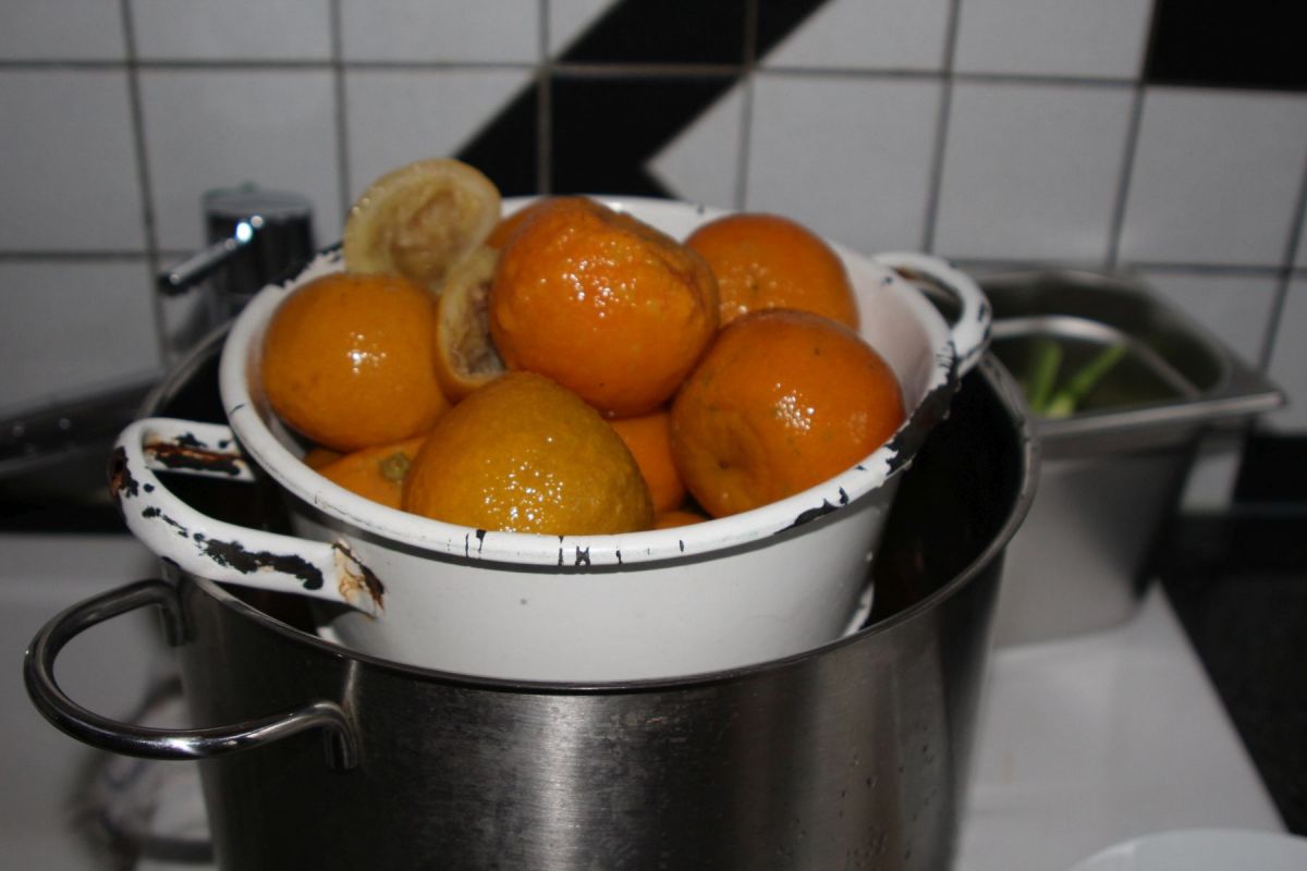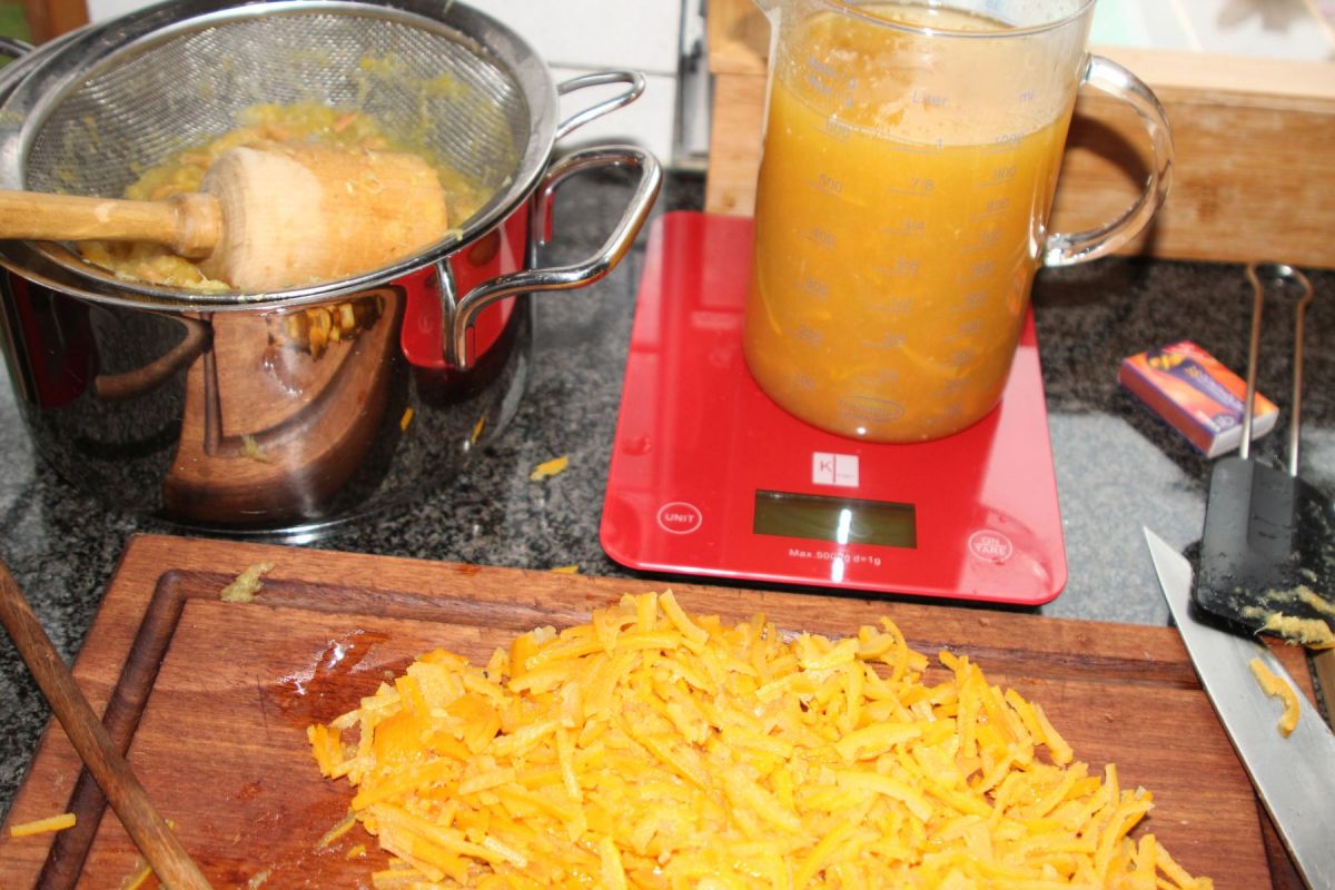 Die Pomeranzen sind schwer zu bekommen. Erntezeit ist im Januar und Februar und unbehandelt, wenn nicht Bio müssen sie sein, weil die Schale verwendet wird. Am Ende gelang die Beschaffung durch Bestellung beim Gemüsehöker ihres Vertrauens. Dann kommt eine Kiste und deshalb sollten die Mengen kontrolliert und der Vorrat an Einmachgläsern gut kalkuliert werden.