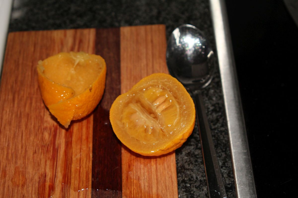 Am nächsten Tag die Früchte abtropfen lassen, dabei die Zitronen entsorgen. Die Orangen halbieren und mit einem Teelöffel das Fruchtfleisch samt Kernen in den Sud zurückgeben. Es bleiben nur die dünnen Reste der Schale nach.Den Saft von den zwei Saftorangen jetzt dazugeben.