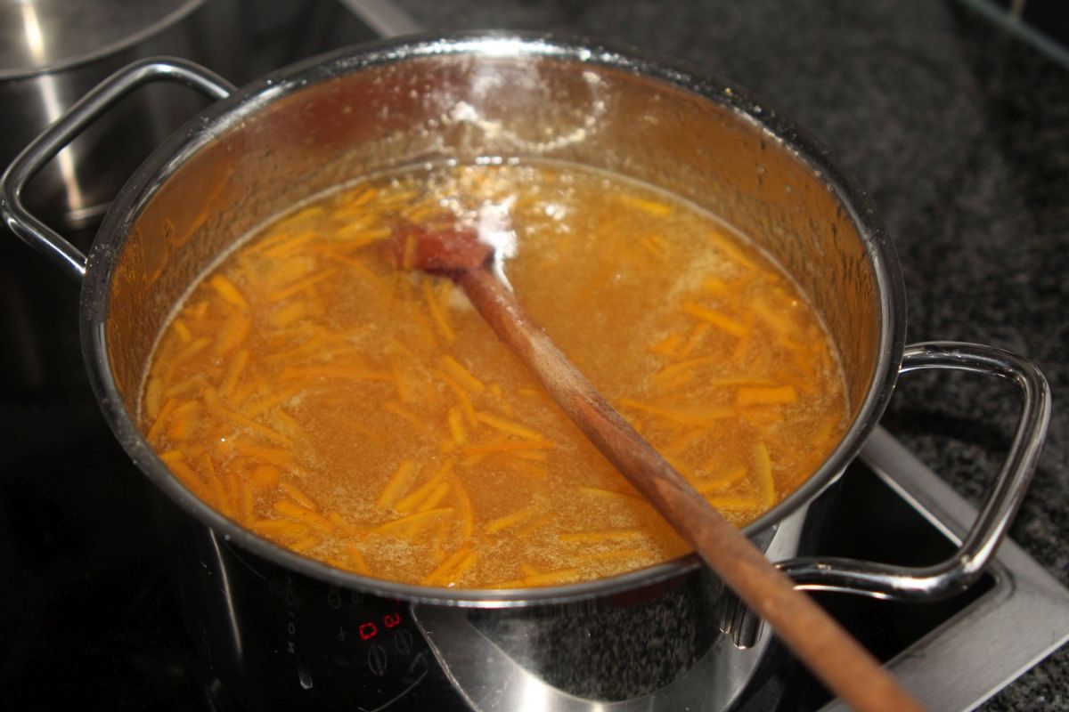 Das Ganze 15 Minuten ohne Deckel kräftig kochen lassen. Während dieser Zeit aus einigen der ausgenommenen Orangenschalen (etwa 12 halbe) feine Streifen schneiden und beiseite legen.