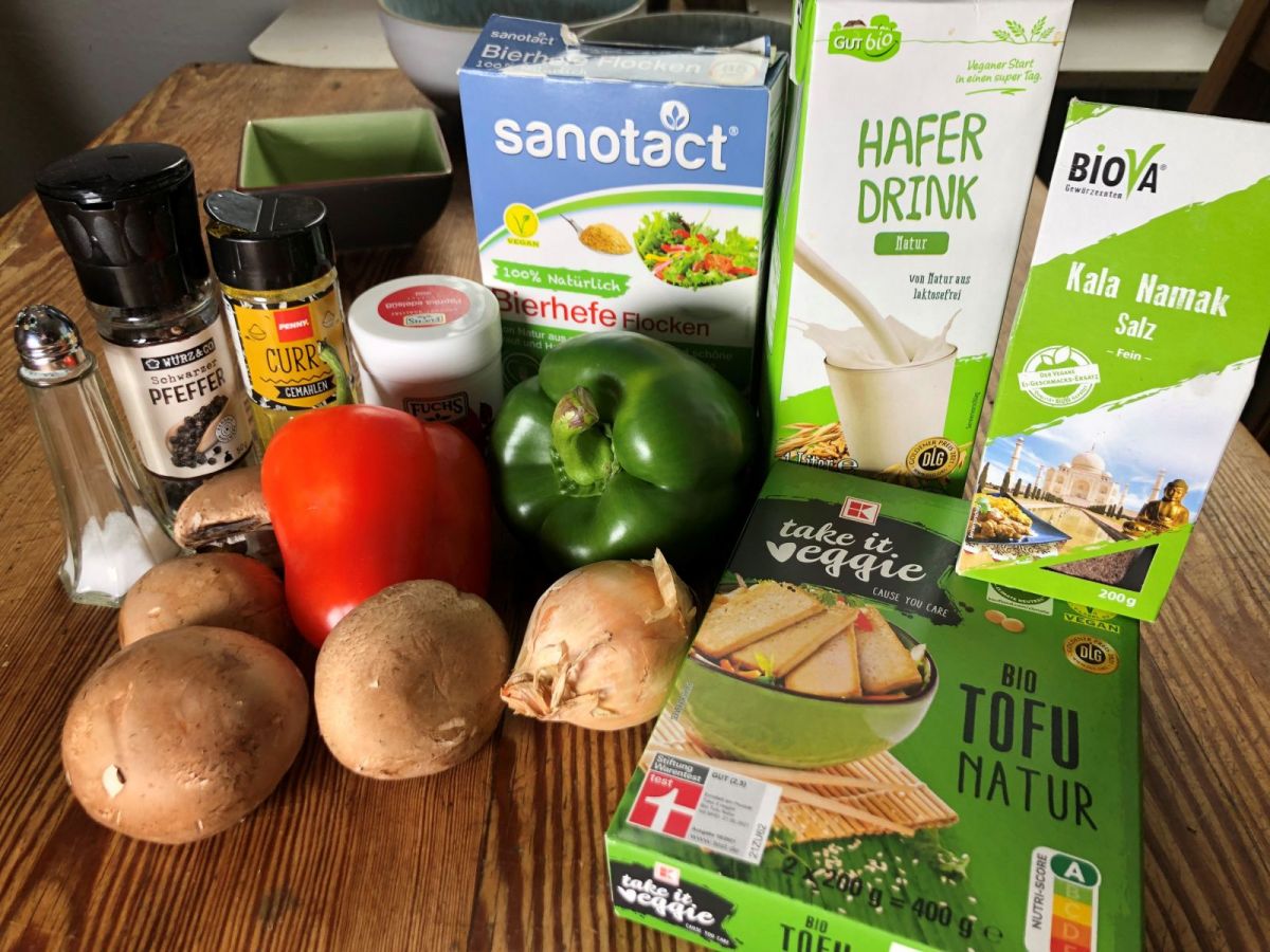 Vorher die Gewürze: Hefeflocken, Paprikapulver und Curry mischen, mit dem Tofu vermengen und die Hafermilch unterheben.