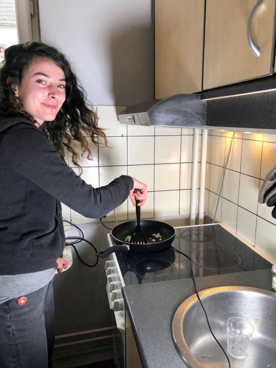 Ronja stellt die WunschZutaten zusammen und brät sie in Olivenöl an.