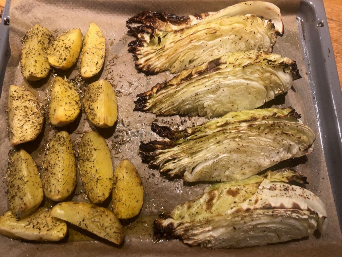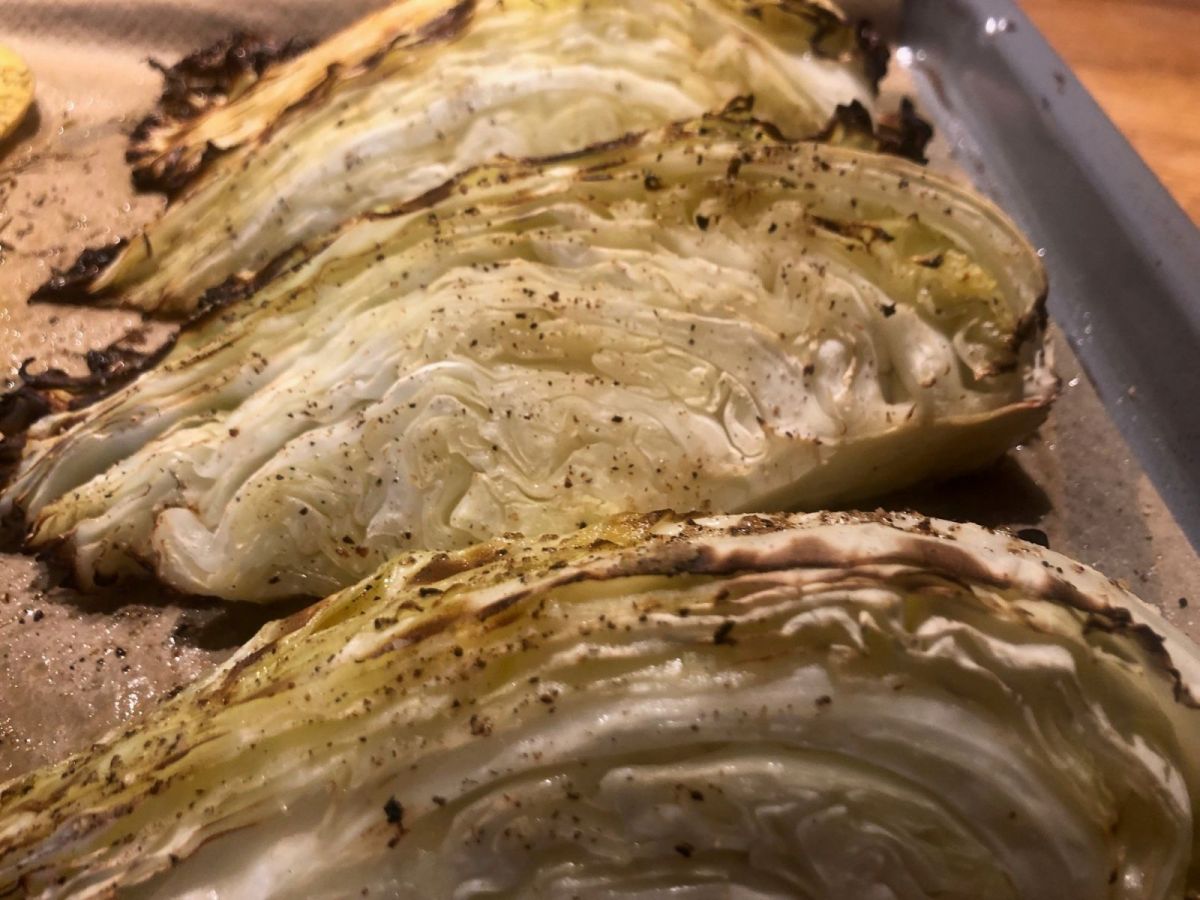 Einen Spitzkohl längs halbieren, dann je nach Größe dritteln oder vierteln und die Stücke roh auf ein Backblech legen. Mit Olivenöl einpinseln, salzen, pfeffern und ab in den Ofen bei 180° für etwa 20 bis 30 Min (Gabelprobe).