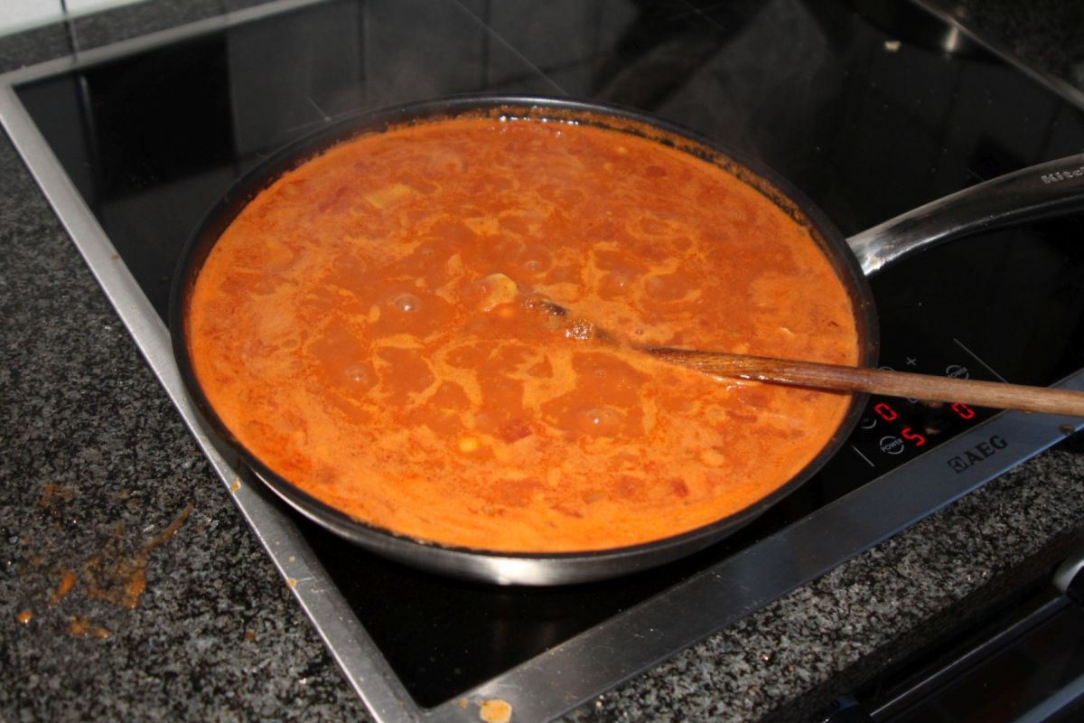 Nun die Currypaste hinzugeben und anrösten, mit Kokosmilch und den Dosentomaten vermengen. Die leere Tomatendose zur Hälfte mit Wasser füllen und ebenfalls in die Pfanne geben. Zum Schluss die Kichererbsen hinzufügen und alles 20 Min köcheln lassen.
