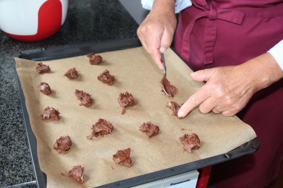 · mit einem Teelöffel den Teig in kleinen Häufchen aufs Backblech