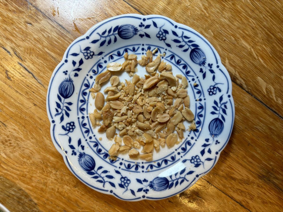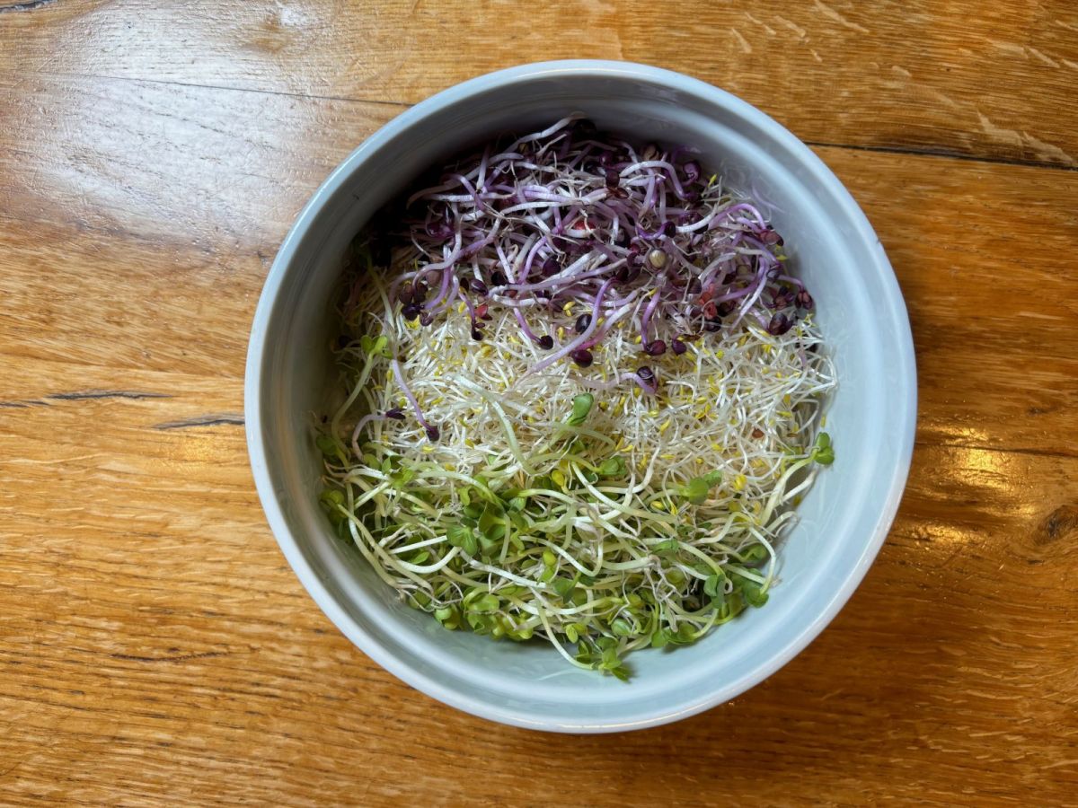 Später dann bei Tisch füllen sich alle ihre Schüsseln mit Sushireis und den Kreationen aus all den schönen bereitgestellten Schüsselchen nach eigenem Geschmack vegan (Ronja), bunt mit Alles (Frauke), auch mit dem traditionellen rohen Fisch (Hans) oder puristisch nur mit gesottenen Karotten (Balthazar). Im Lokal gibt es drei Beilagen+Huhn/Tofu/Shrimps.