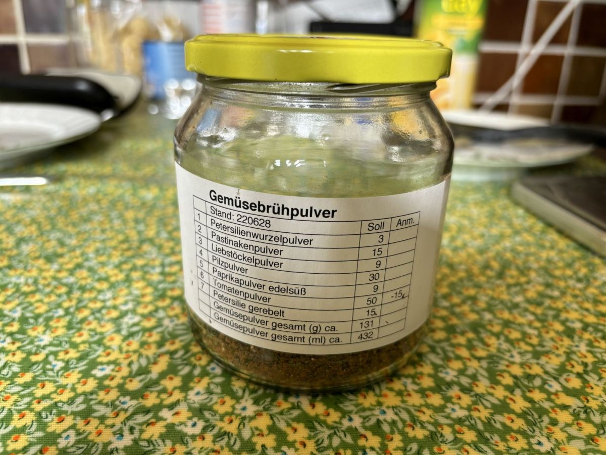 Salz, Pfeffer, Brühenpulver (2 gehäufte TL), Rosenpaprika, Senfkörner, Lorbeerpulver (1 EL), Wacholder, Liebstöckel