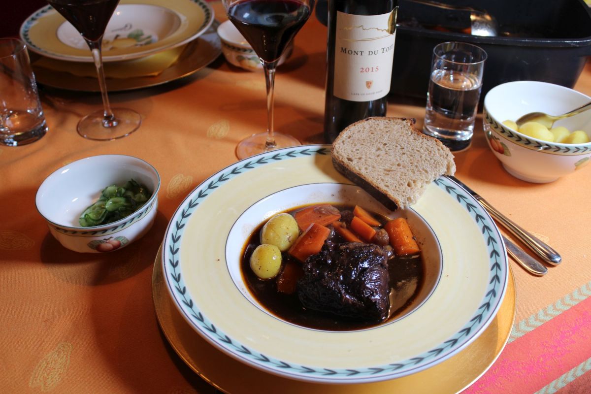 - 1 - 1,5 Flaschen trockener Rotwein (zum Einlegen und Kochen)