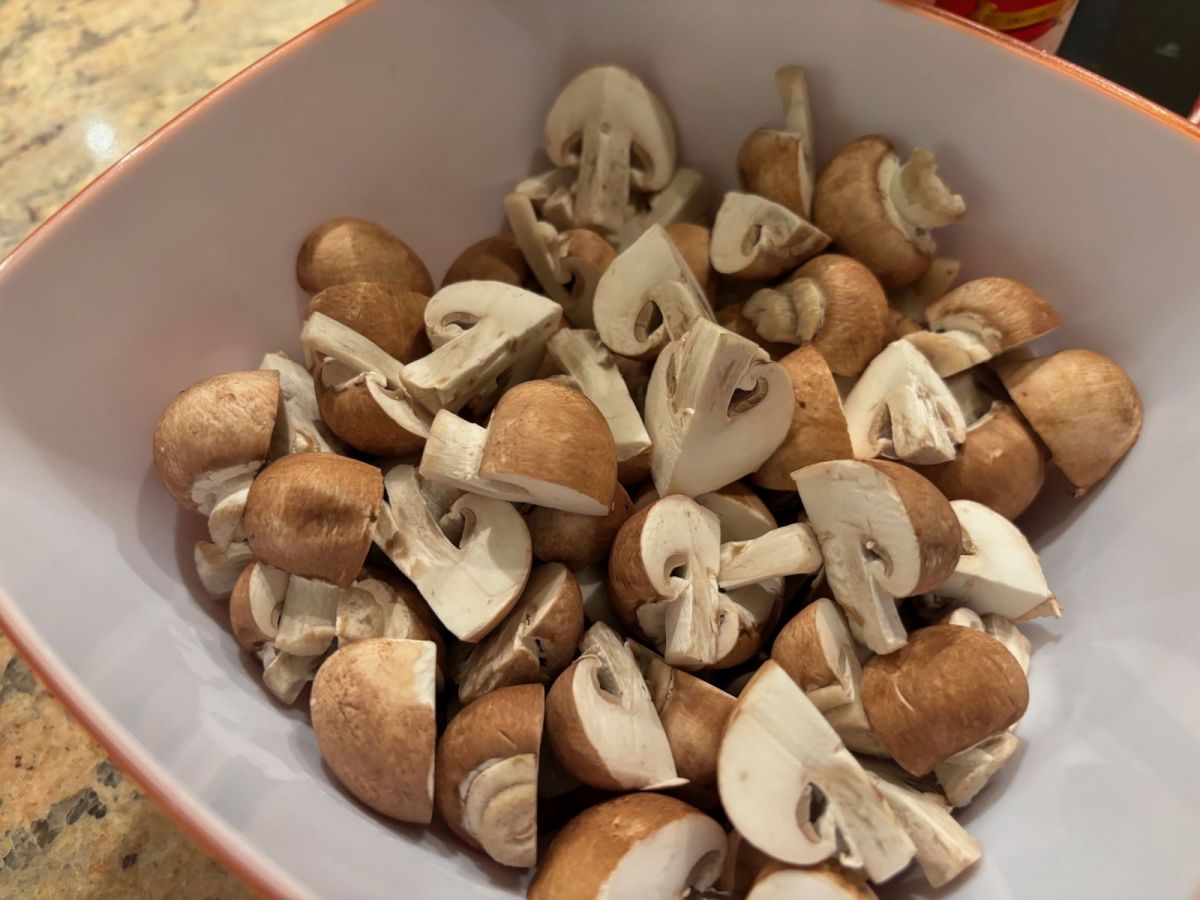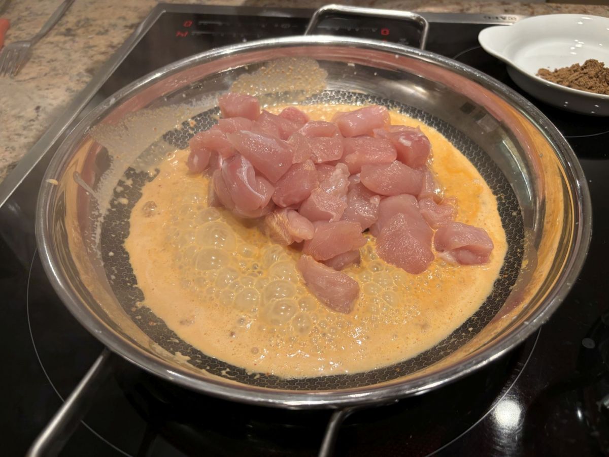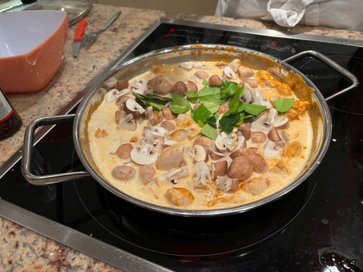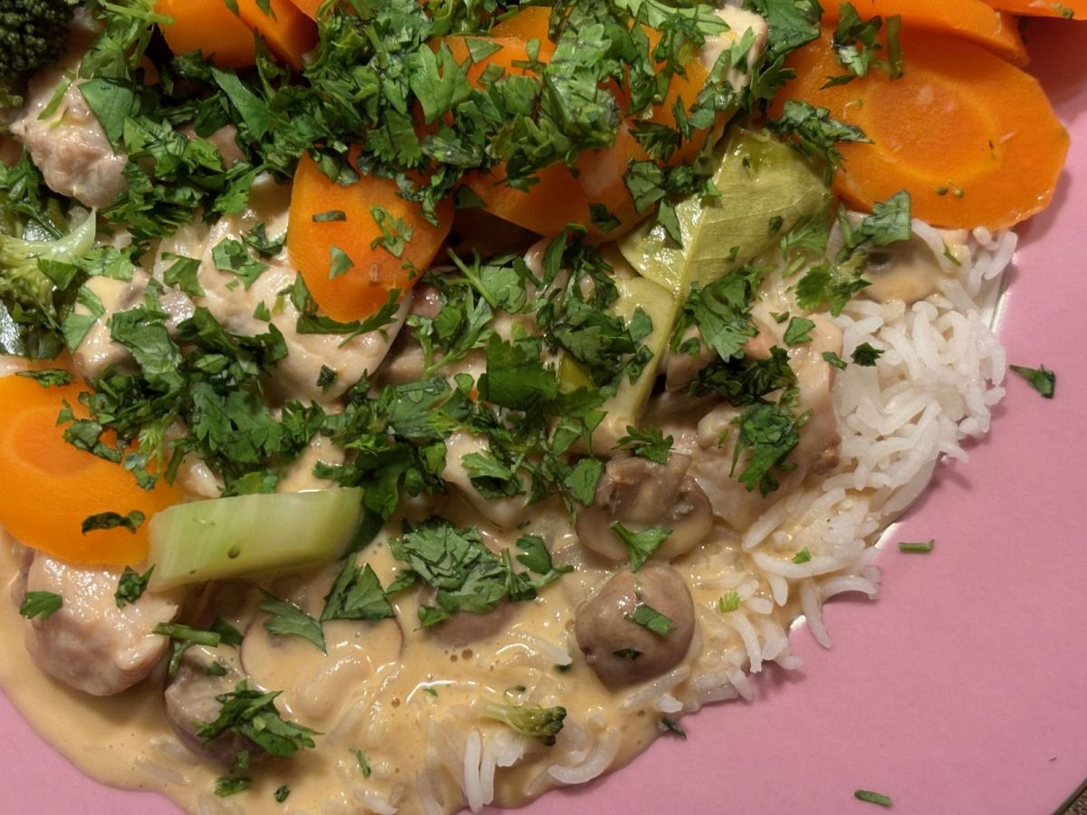 Dann noch eine schöne Menge geviertelte Champignons in die Kokosmilch und alles noch ein bisschen köcheln lassen, bis die Champignons durch und die Hühnchenhäppchen nicht zu durch sind. Mit Salz oder Fischsauce abschmecken und zum Schluss mit Maisstärke oÄ so andicken, dass eine sämige Konsistenz entsteht. Obendrauf geben wir dann das nebenbei im Einsatz gedämpfte Gemüse (zB Möhren und Broccoli) und als Krönung wird auf dem Teller der frisch zerkleinerte Koriander über das Ganze gestreut ...guten Appetit:))