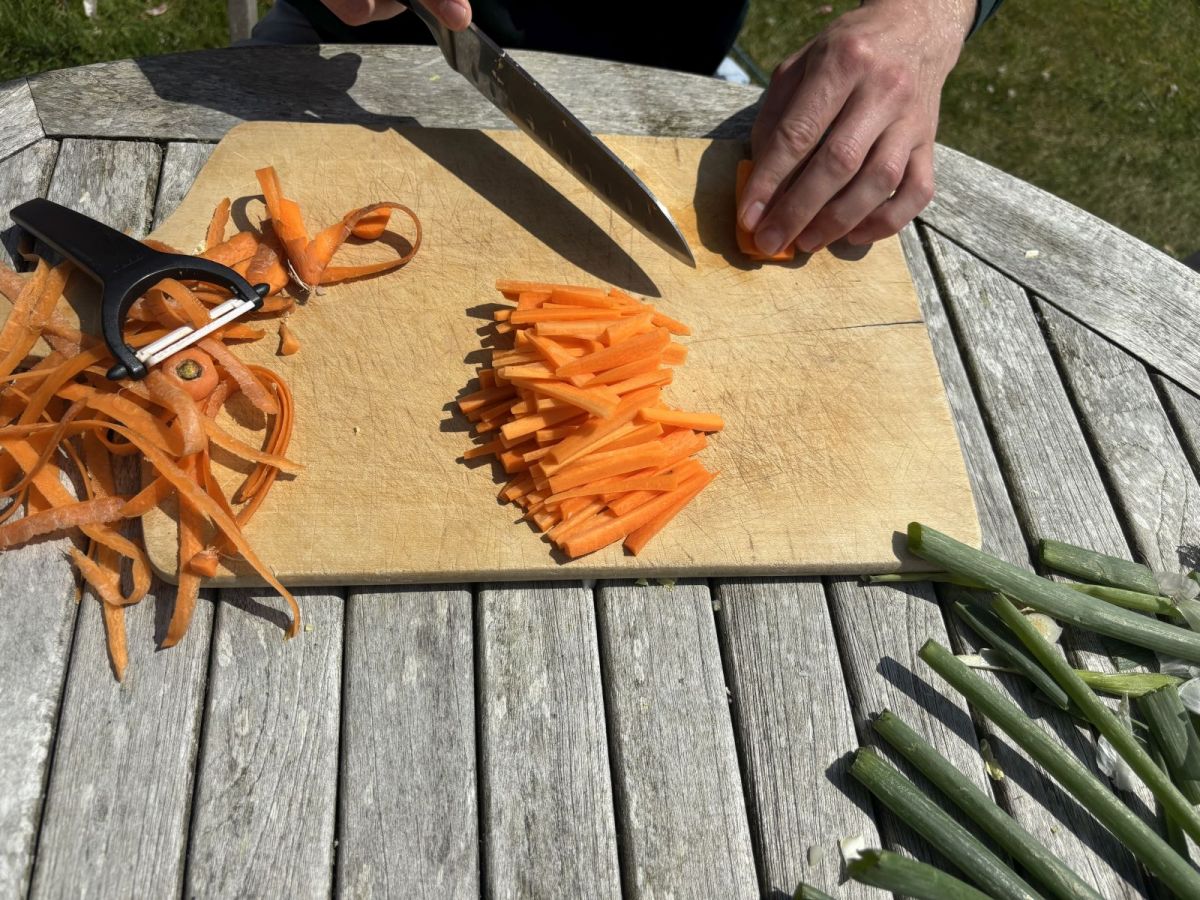 Inzwischen die Frühlingszwiebeln längs teilen und in ca 5 cm lange Streifen schneiden, die Karotten ebenso verarbeiten.