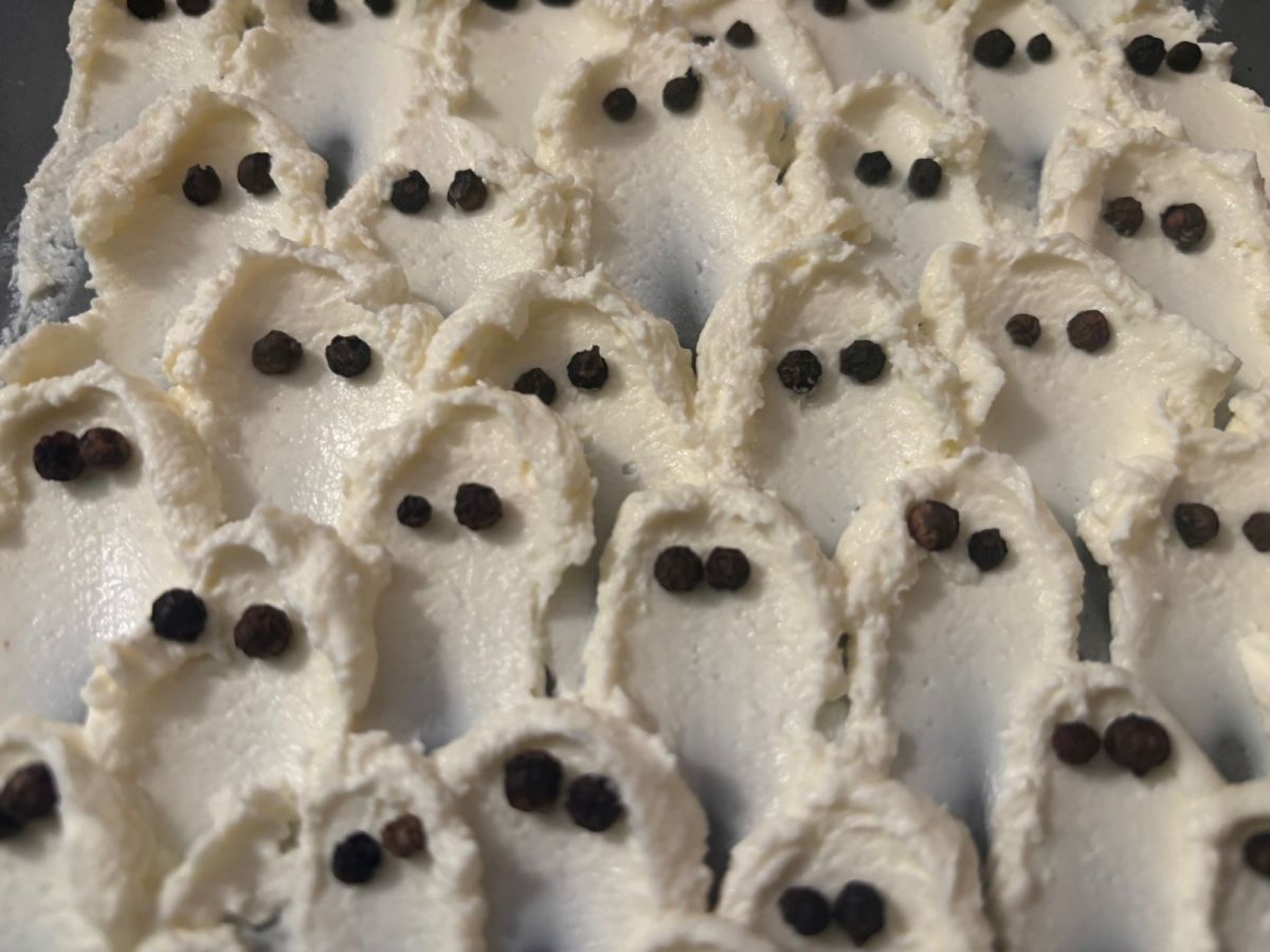 Für den anschließenden Spiele-Marathon wurden dann Gruselsnacks in Szenen gesetzt: Gespenster aus Frischkäse mit Augen aus schwarzem Pfeffer die mit Crackern, Salzstangen und Weintrauben gesnackt wurden.