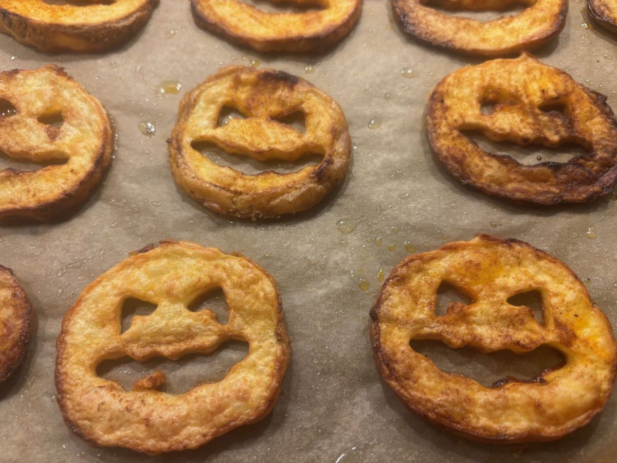 Große Kartoffeln in dünne Scheiben schneiden und mit einer KürbisKeksform ausstechen, salzen und würzen mit zB Paprikapulver. Anschließend im Backofen garen und bräunen.