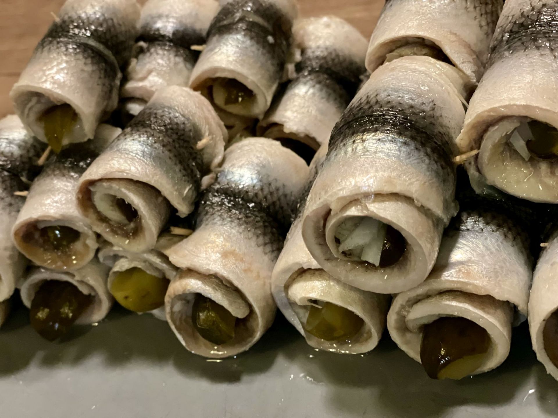 Den Hering unten längs einschneiden und aufklappen. Kopf und die Mittelgräte mit dem Schwanzende entfernen und den aufgeklappten Fisch mit einem Stück Gewürzgurke und einem Zwiebelstück aufrollen. Die Röllchen mit Zahnstochern feststecken.