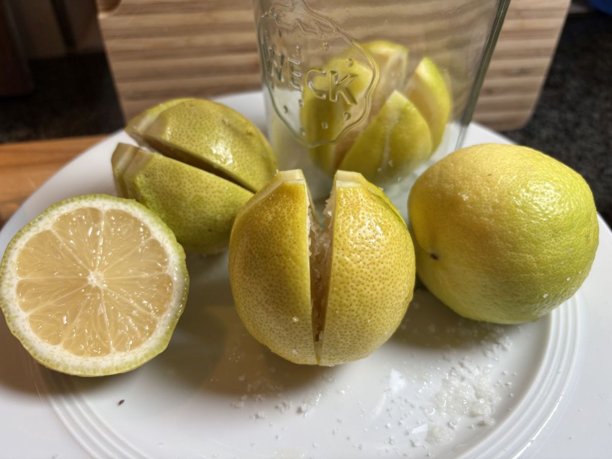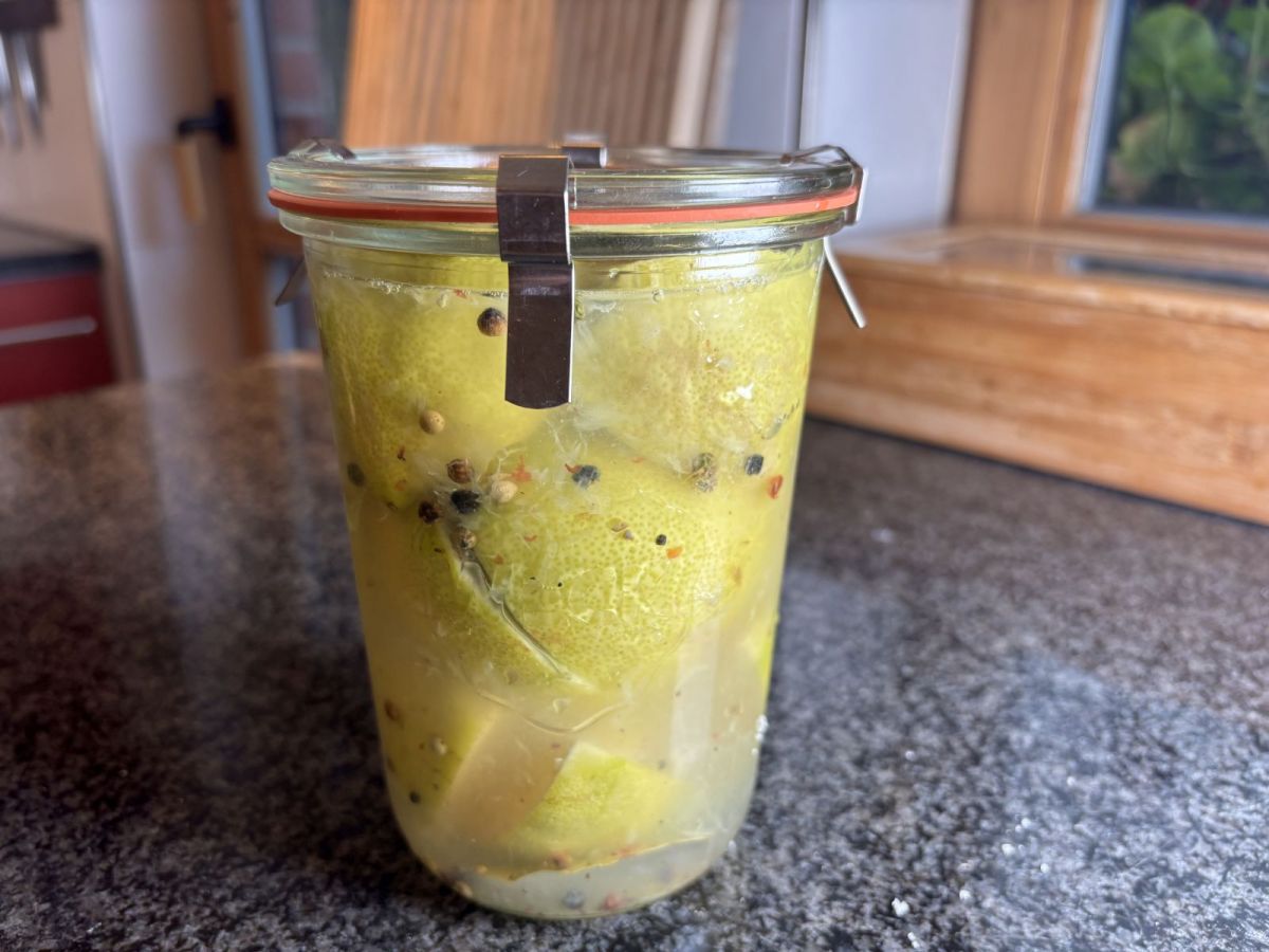 Früchte dicht nebeneinander in ein sterilisiertes Einmachglas (1,5 l Inhalt mit Glasdeckel) füllen. Die übrige Zitrone halbieren, auspressen und den Saft mit dem zuvor aufgefangenen Saft sowie dem restlichen Salz in das Einmachglas geben. Falls noch etwas Platz im Glas sein sollte, die Zitronen mit einem sterilisierten Kieselstein oder Teller in passender Größe beschweren und das Glas mit kochendem Wasser auffüllen, sodass die Zitronen vollständig mit Wasser bedeckt sind. Das Glas mit dem Deckel verschließen und für 3-4 Wochen bei Zimmertemperatur ruhen lassen.